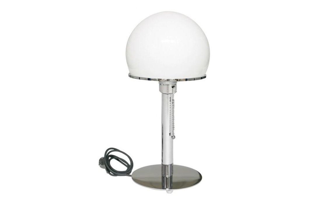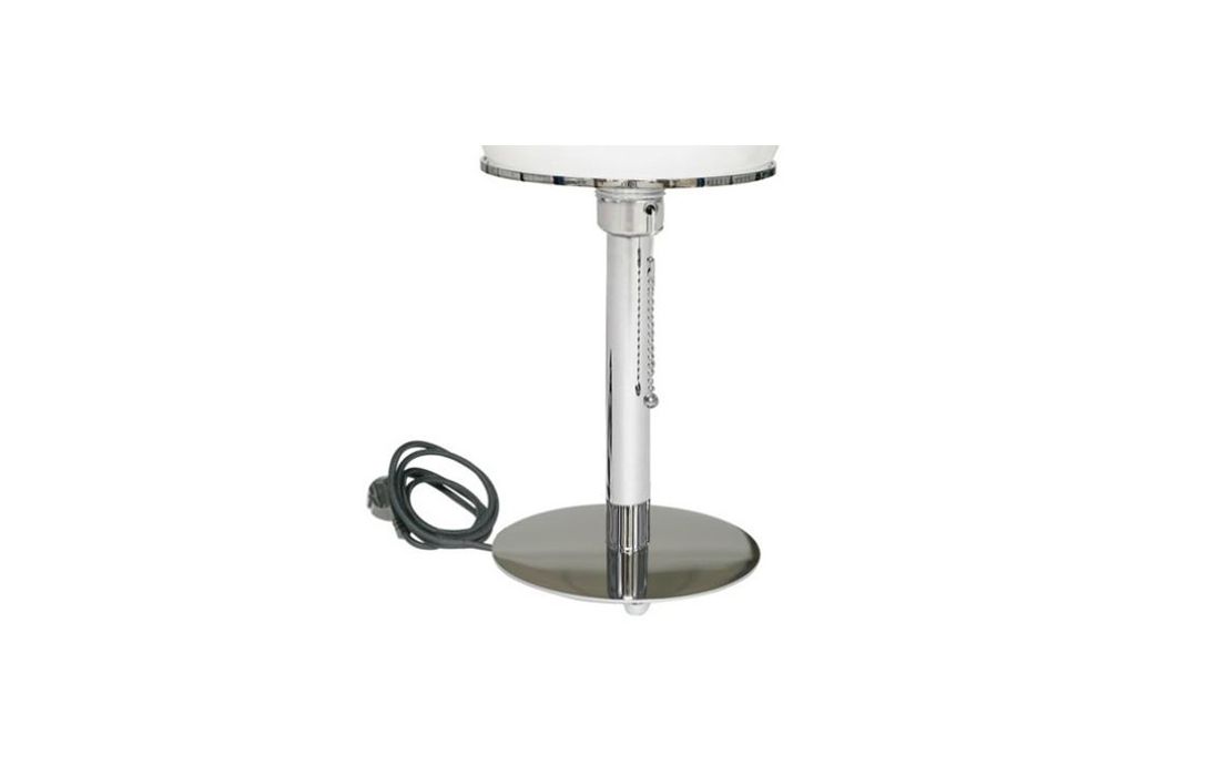 Candeeiro de mesa com base em metal cromado e abajur em vidro branco.Destinatário :