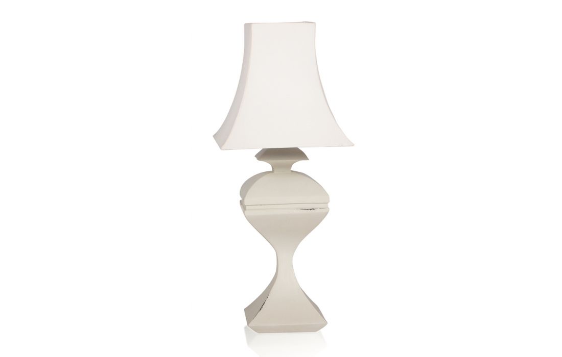 Candeeiro de mesa com estrutura em madeira e abajur em branco.Destinatário :