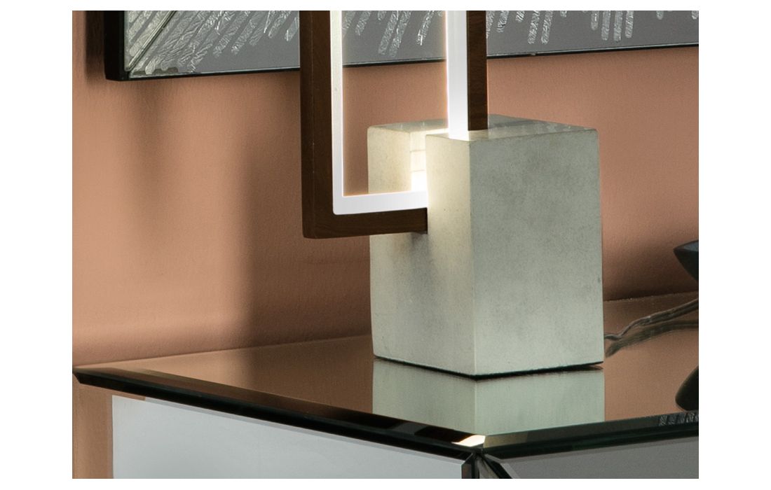 Candeeiro de mesa LED em acrílico, alumínio e metal. Acabamento para o quadro a imitar madeira escura e base com imitação de cimento.Destinatário :