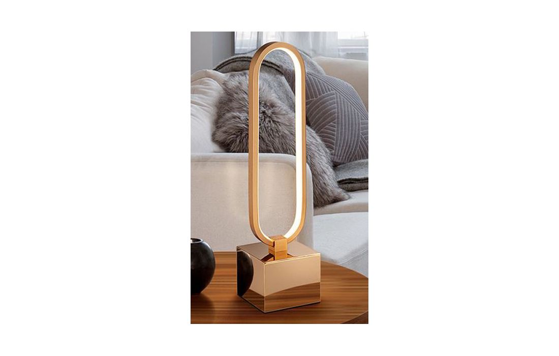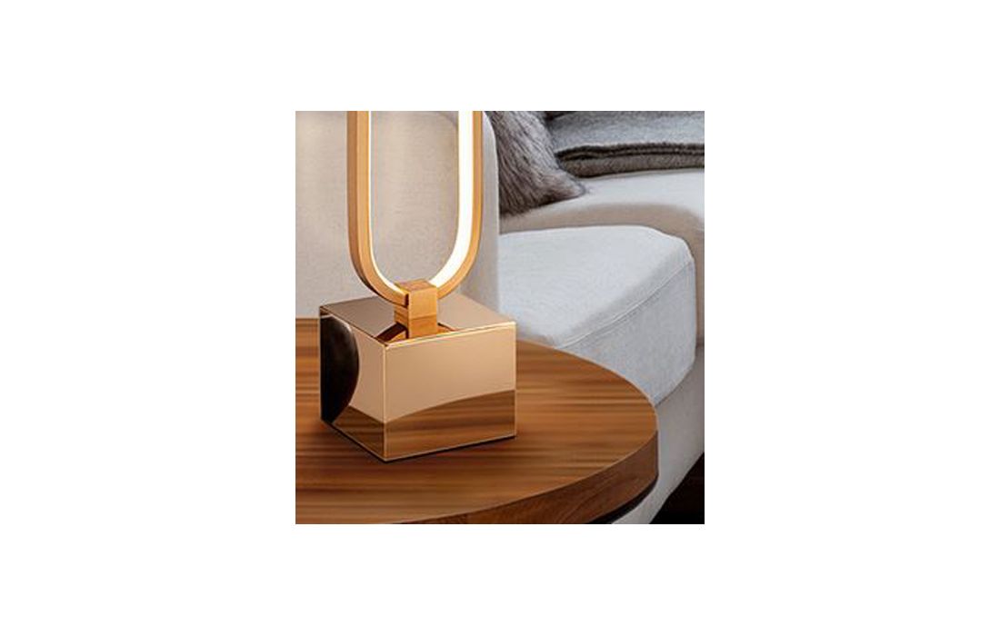 Candeeiro de mesa 1 luz LED, realizado em alumínio escovado com acabamento dourado e base de metal brilhante. Difusores de silicone opalino.