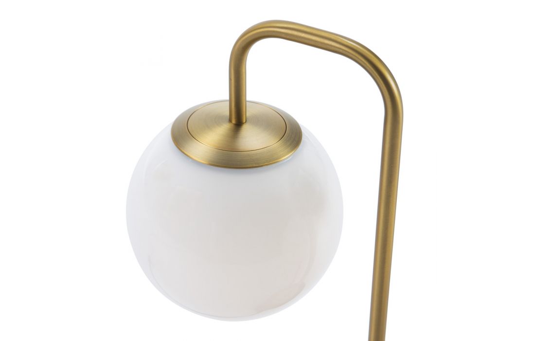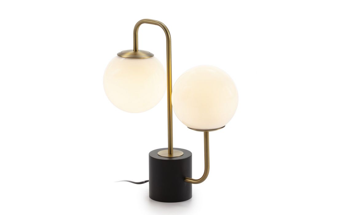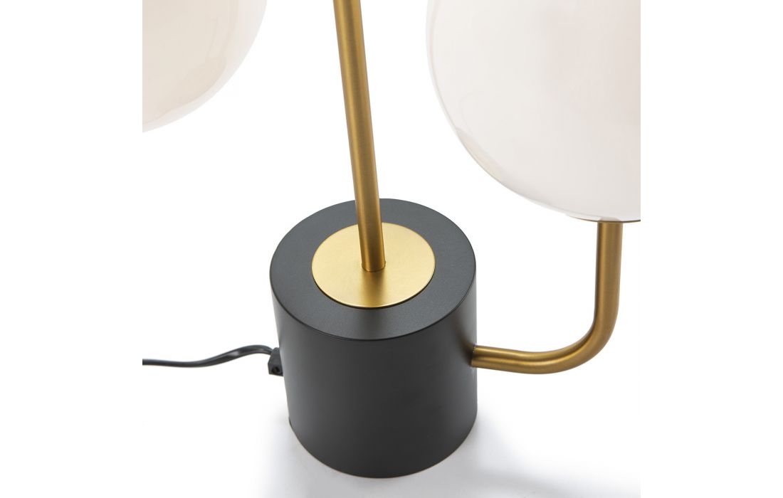 Candeeiro de mesa em metal dourado e preto com esferas de vidro.