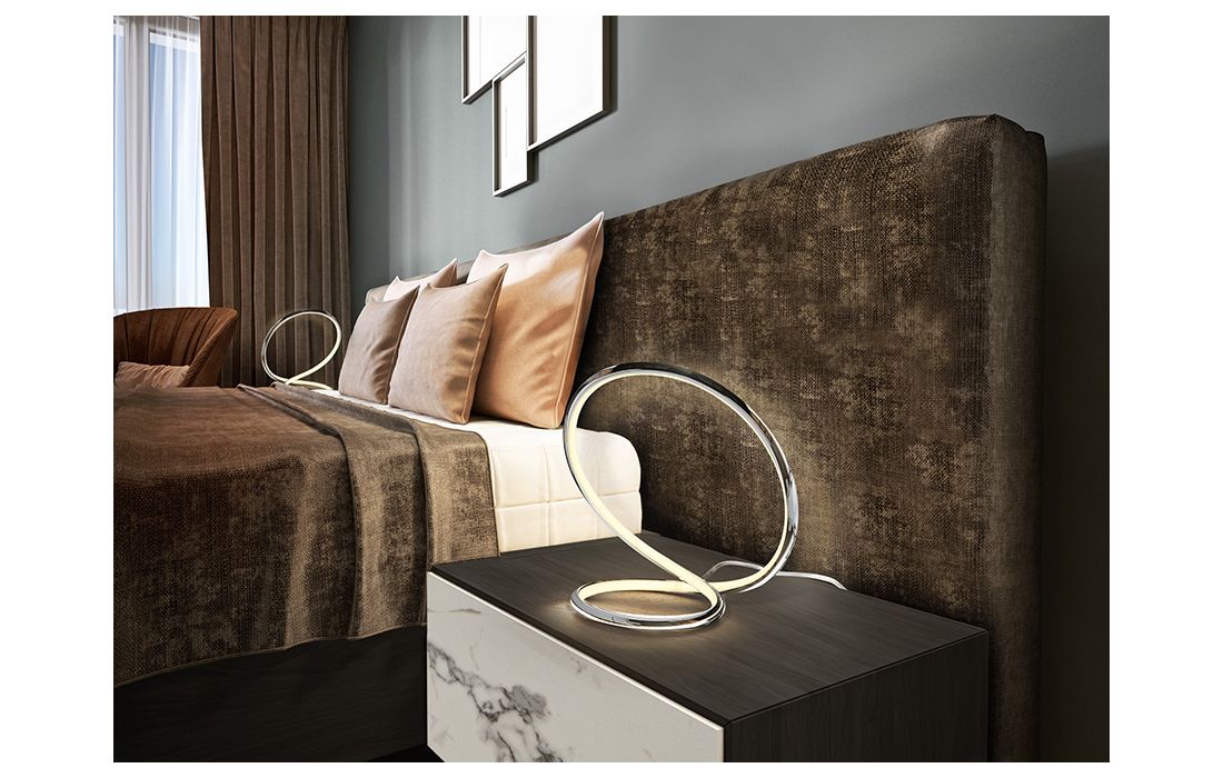 Candeeiro de mesa em alumínio com acabamento cromado. Difusor opalino de silicone
