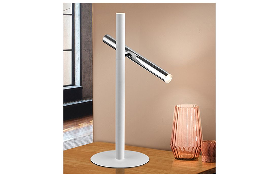 Candeeiro de mesa de 2 luzes Led em metal com acabamento cromado e branco mate. Difusor acríçico opalino