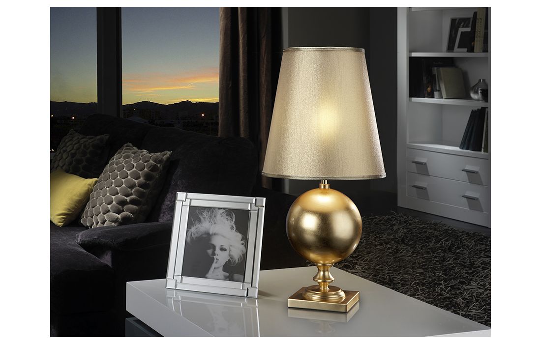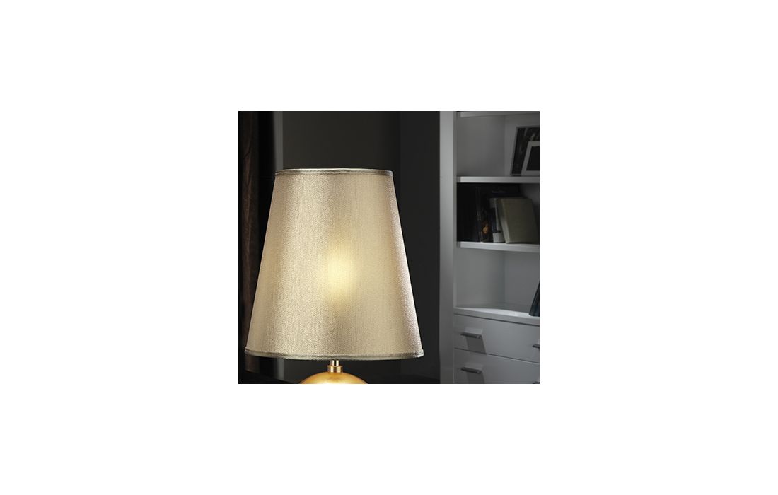 Candeeiro de mesa de 1 luz em metal com acabamento dourado e abajour em tecido