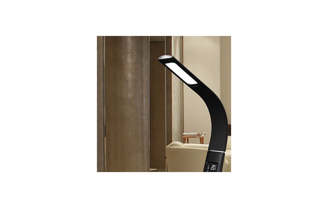 Candeeiro de mesa Led em ABS e borracha de cor preta, textura de pele, braço flexivel, intensidade regulavel e ecrã VA com relógio, alarme, calendário e termómetro