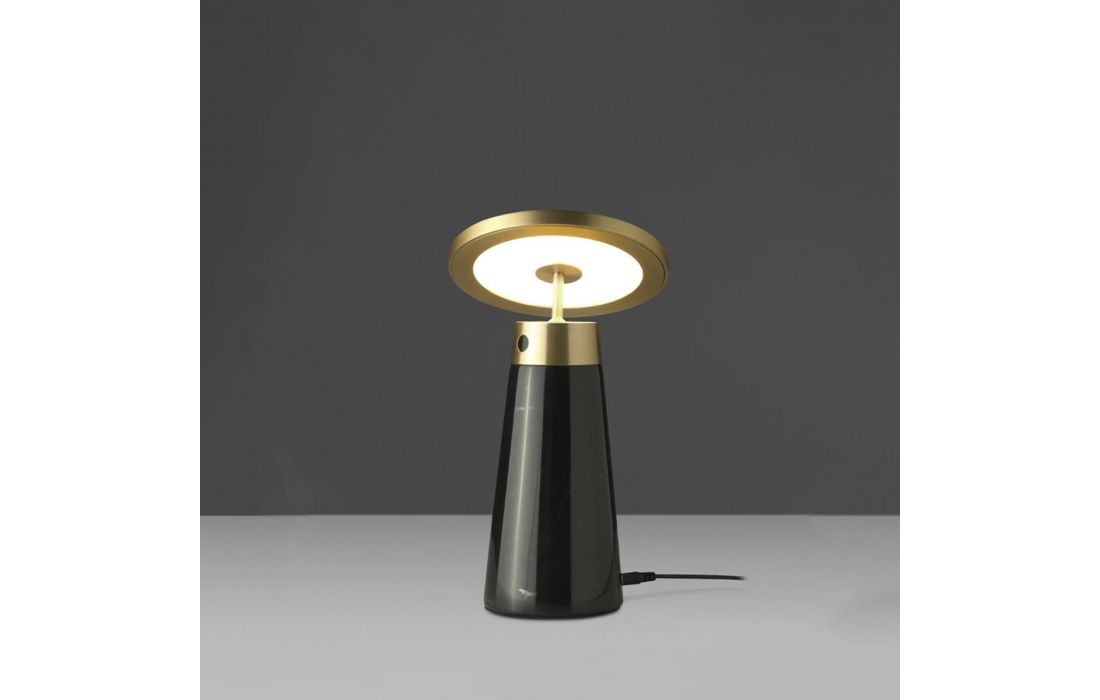 Candeeiro de mesa com corpo em porcelanato nero marquina similar e disco direcional em aço dourado polido. Possui dimmer ajustável em intensidade e corDestinatário :