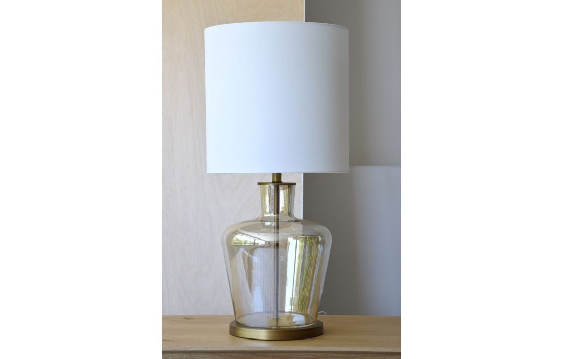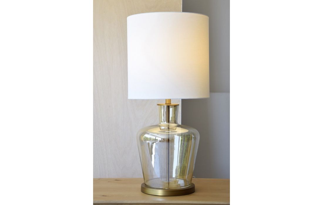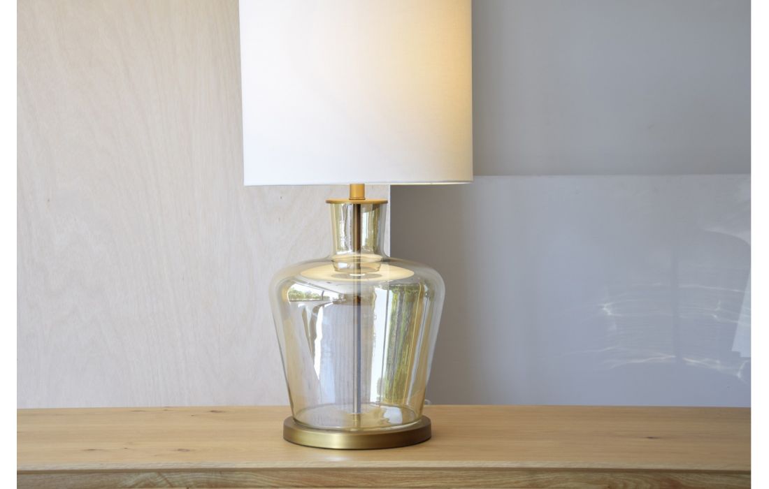 Candeeiro de mesa feito em vidro no cor âmber transparente com base em metal com acabamento dourado envelhecido mateDestinatário :