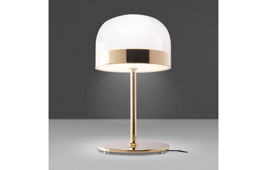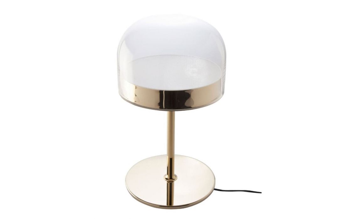 Candeeiro de mesa com corpo, base e detalhes em aço dourado. Tela em forma de cúpula de vidro transparente.Destinatário :