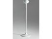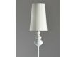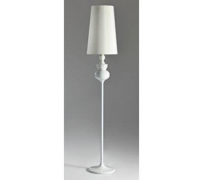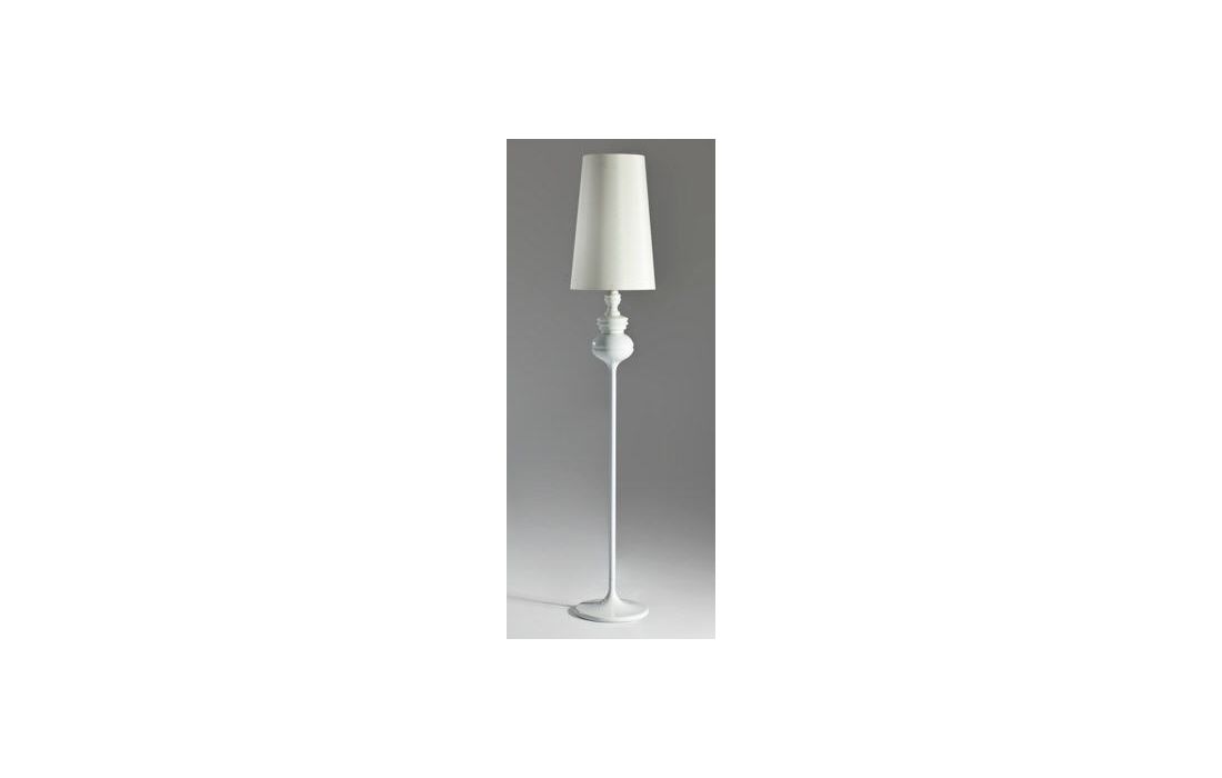 Candeeiro de pé com base em metal branco e abajur em branco.