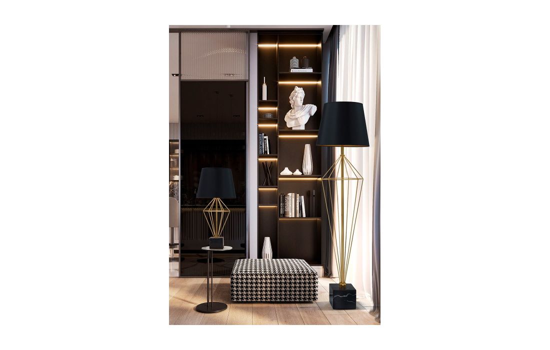 Candeeiro de pé em tons de dourado, torna este candeeiro moderno e elegante, o seu abat-jour escuro torna a peça mais discreta, podendo assim ser adaptado a diversos espaços e decorações.Dimensões em cmD 45 A 165 Prazo de Entrega10 a 15 dias