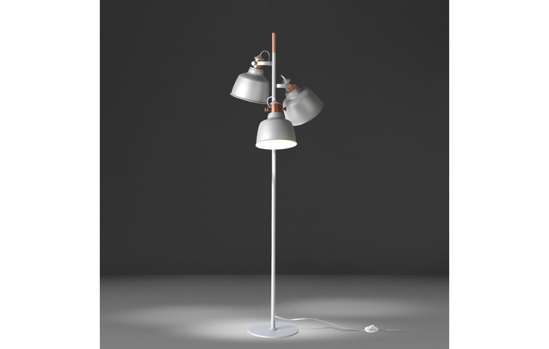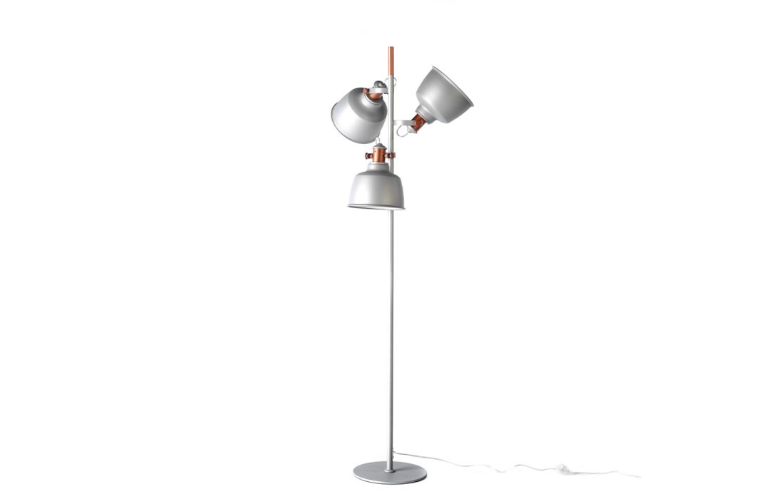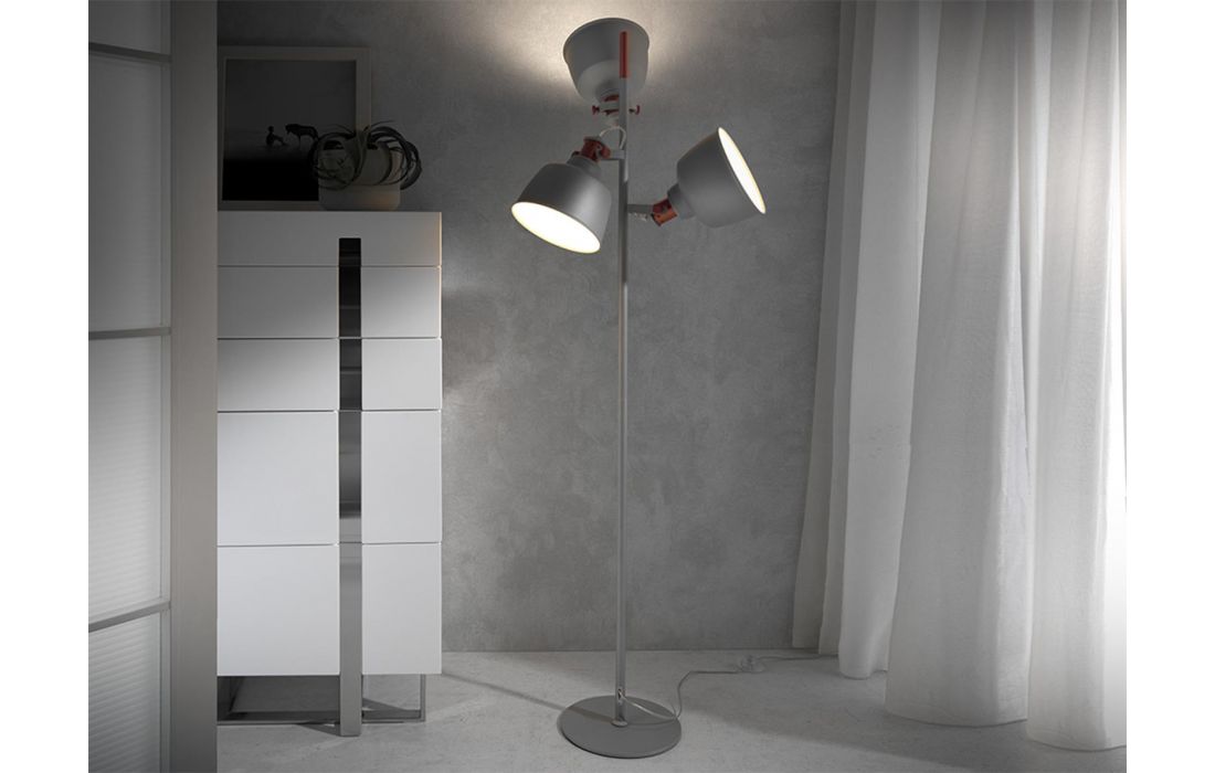 Candeeiro de pé com três abajures multidirecionais em aço inoxidável pintado em epóxi cinza e detalhes em bronze.Destinatário :