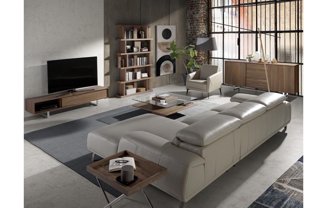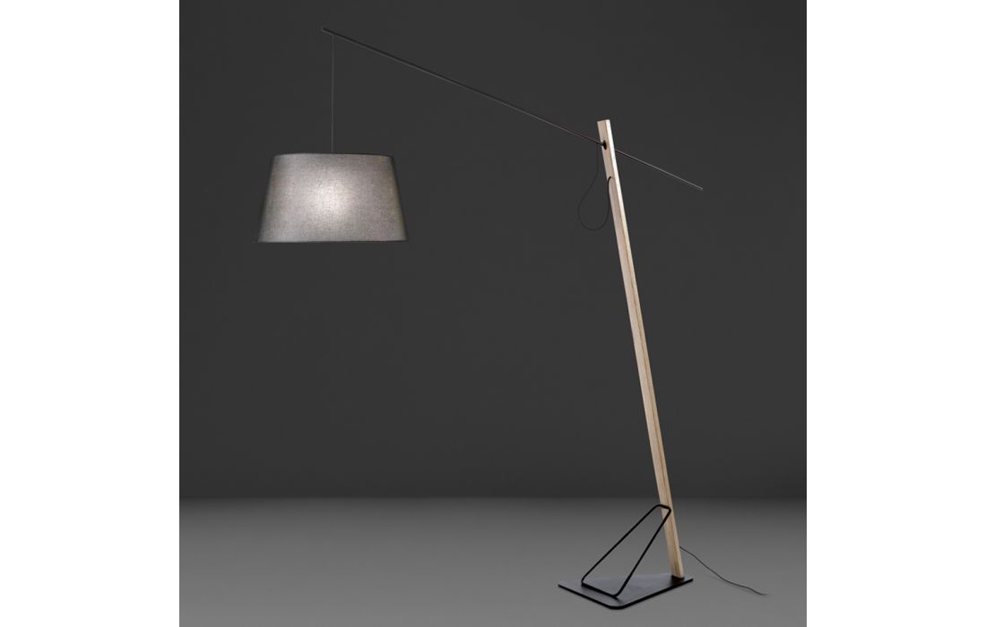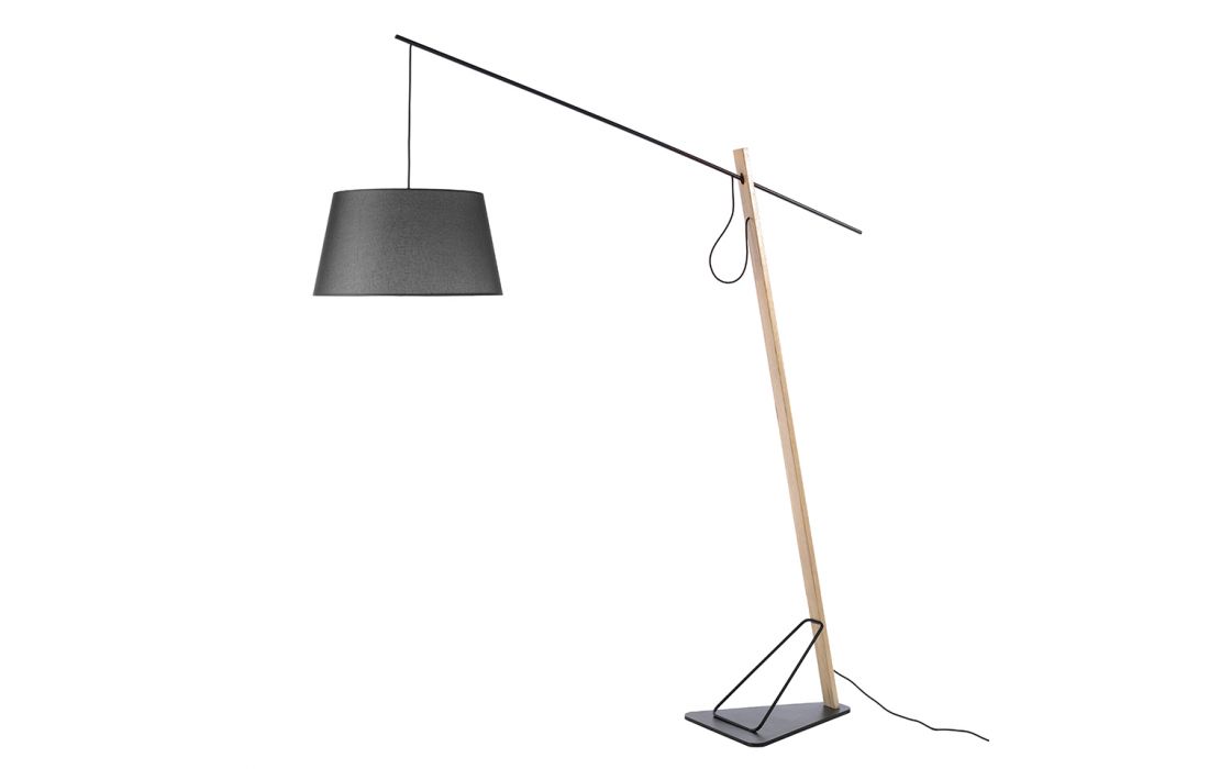 Candeeiro de pé com abajur de tecido e distância ajustável. Feito de madeira folheada a carvalho e aço inoxidável preto para a base e posteDestinatário :