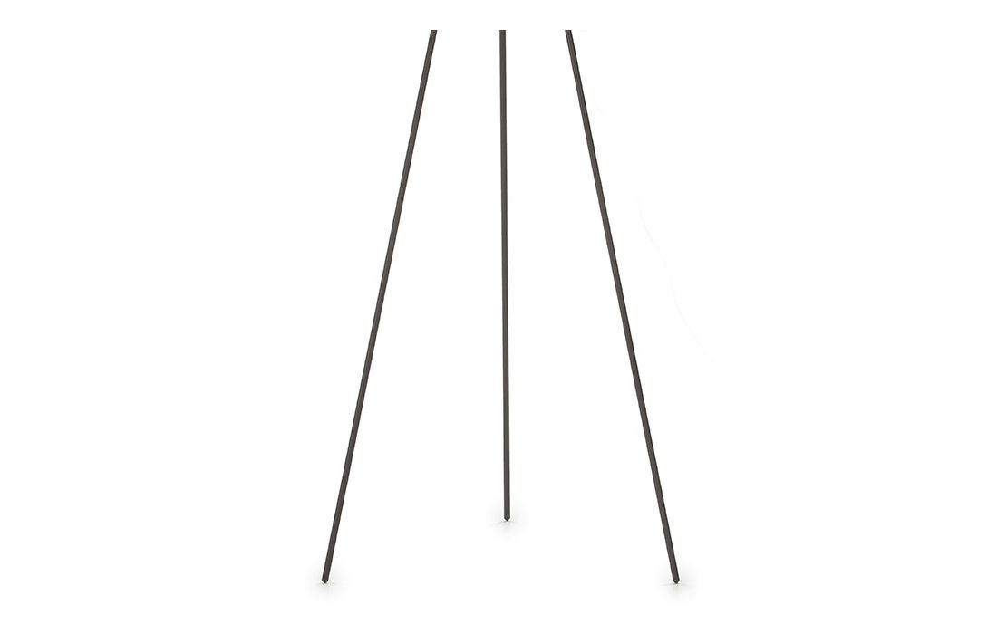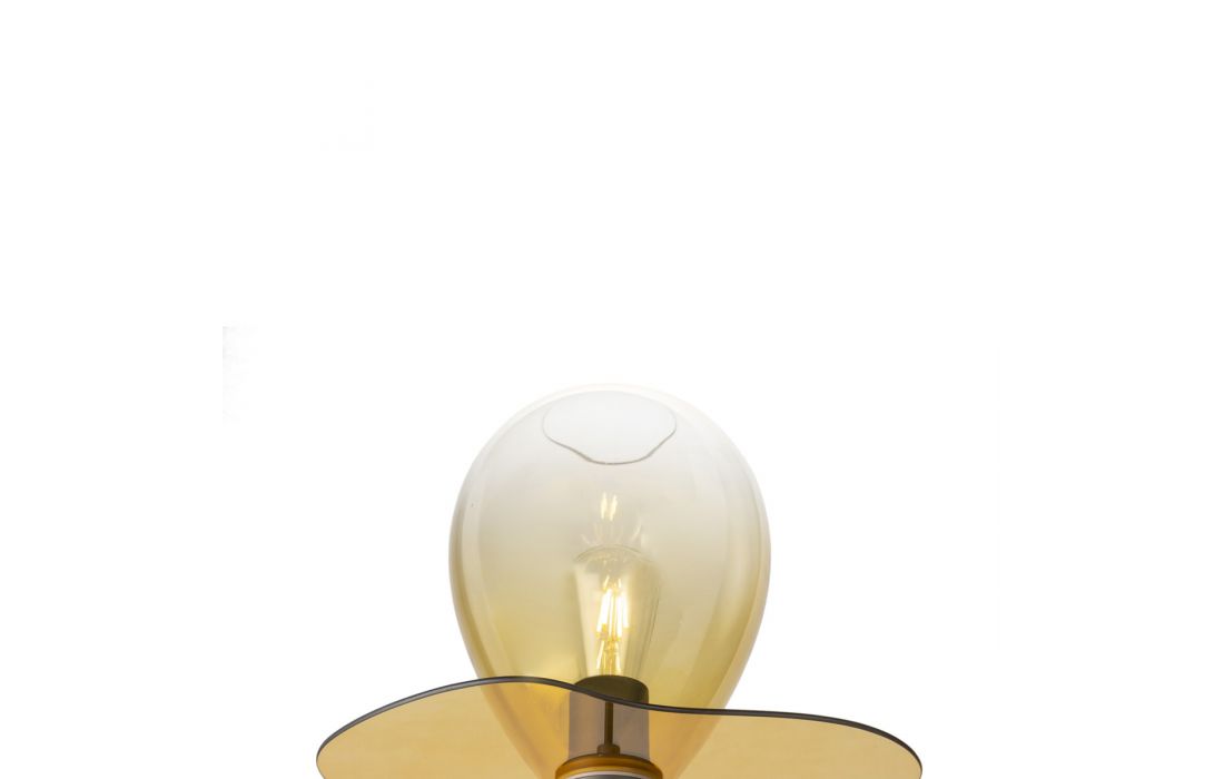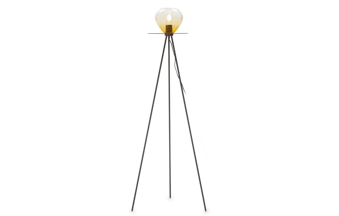 Candeeiro de pé feito em metal preto e vidro âmbar