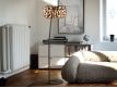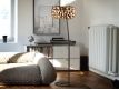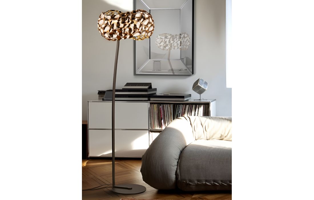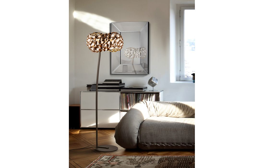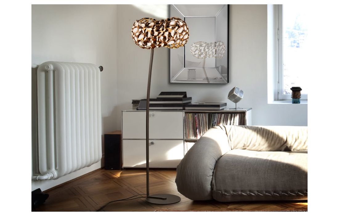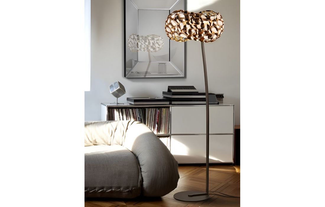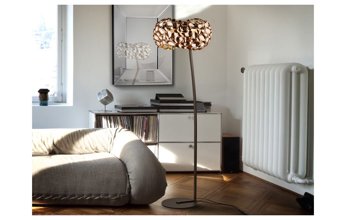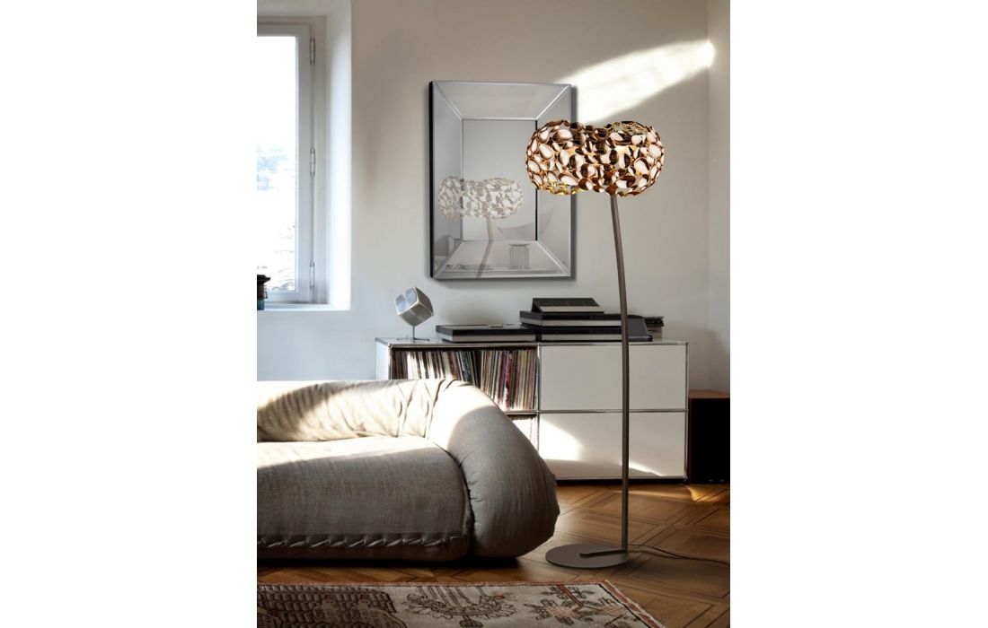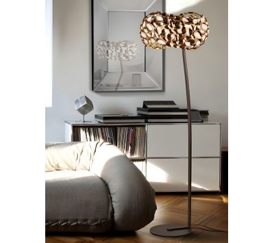 Candeeiro de pé de 5 luzes, realizado em metal banhado a ouro e pintura em castanho escuro. Difusor acrílico interior.Destinatário :