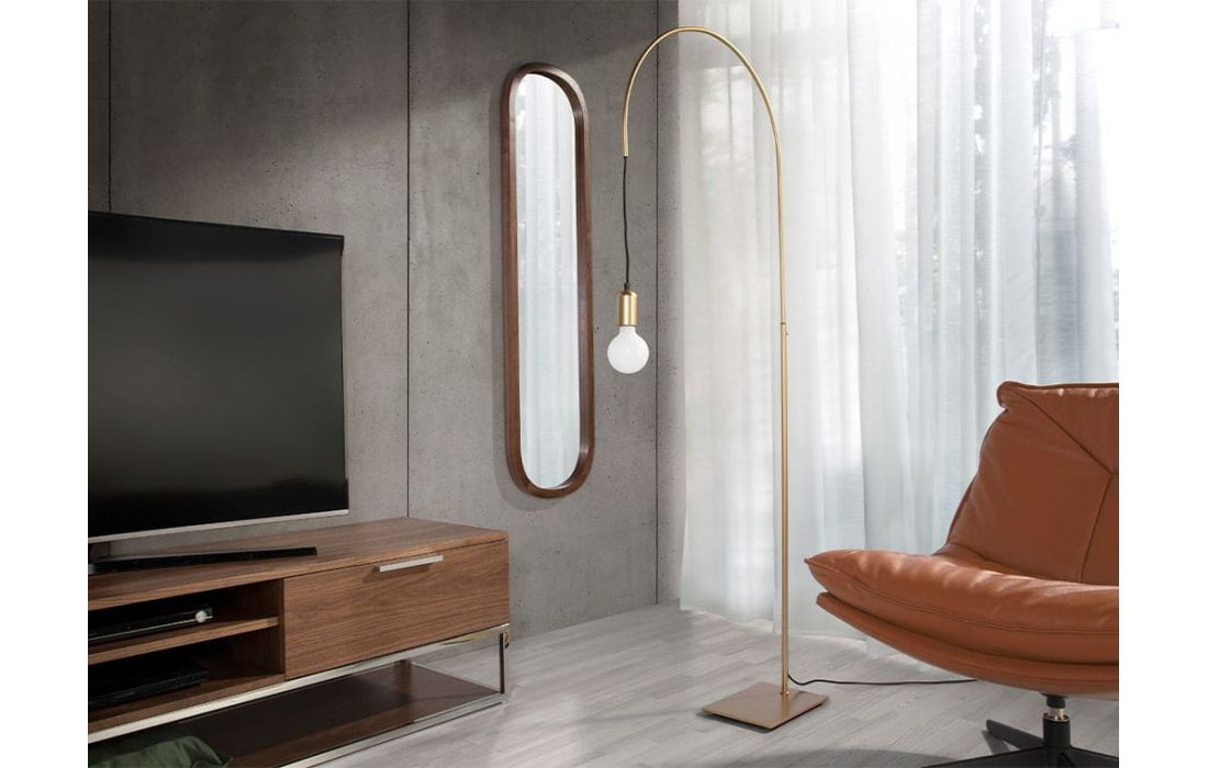 Candeeiro de pé em forma de arco, regulável em altura, fabricado em aço inoxidável dourado.Destinatário :