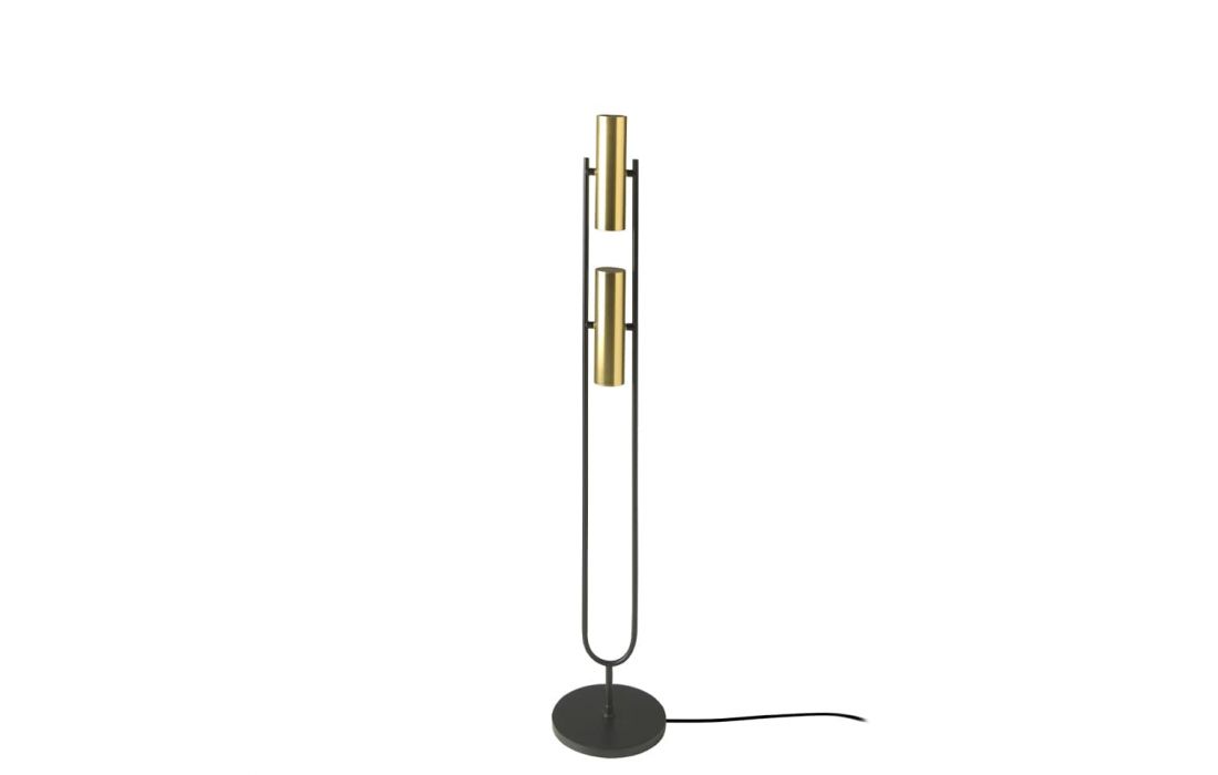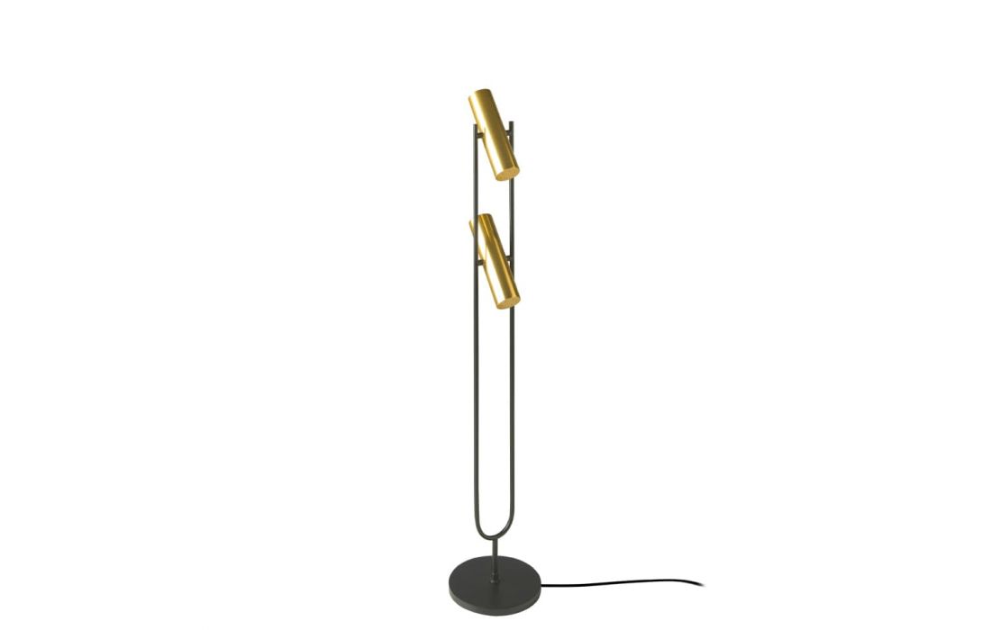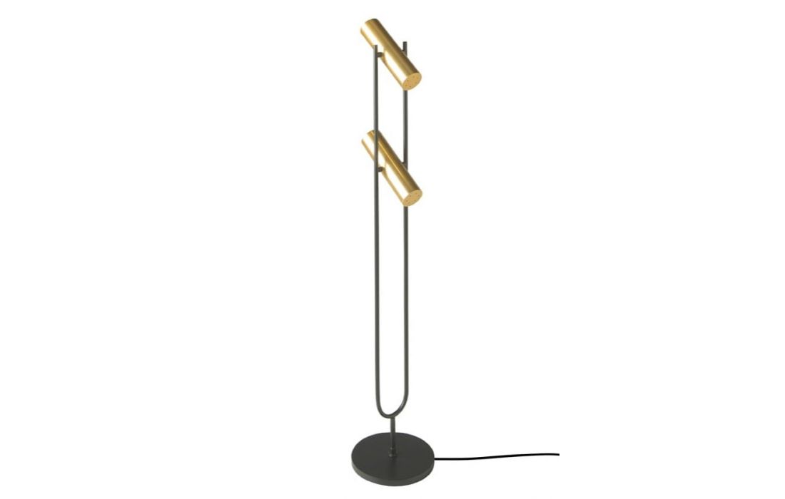 Candeeiro de pé em aço inoxidável preto com dois holofotes dourados ajustáveis.Destinatário :
