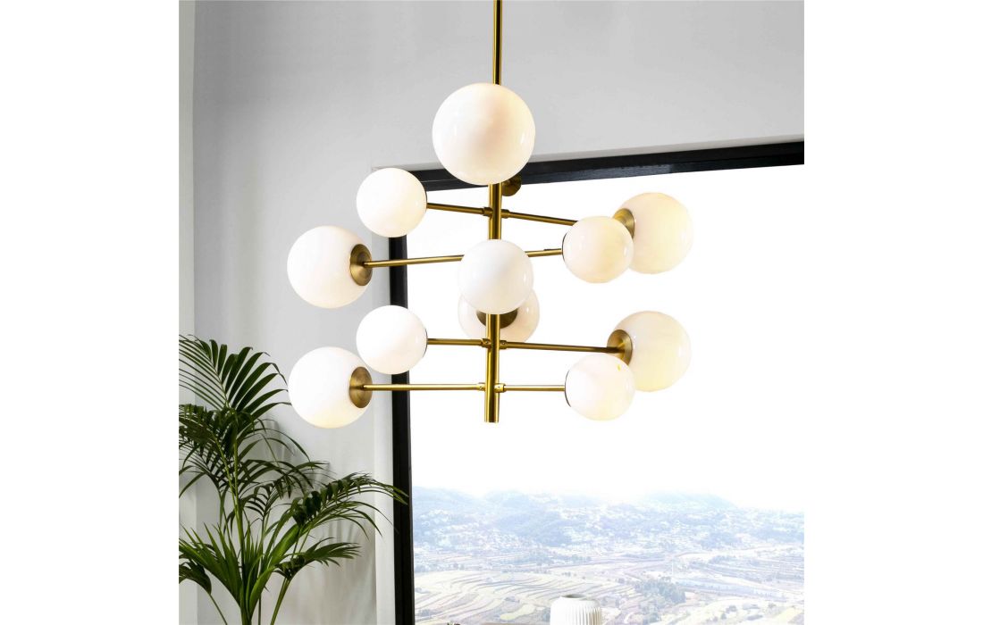 Candeeiro de teto de vidro e metal com acabamento em dourado.