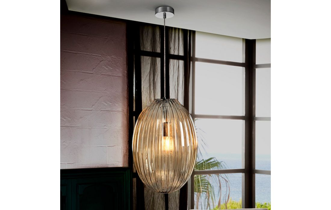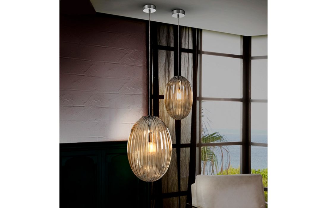 Candeeiro de teto de 1 luz feito em metal acabamento cromodo. Tulipa grande de dois tons de vidro: conhaque e cinzento smoke espelhado.