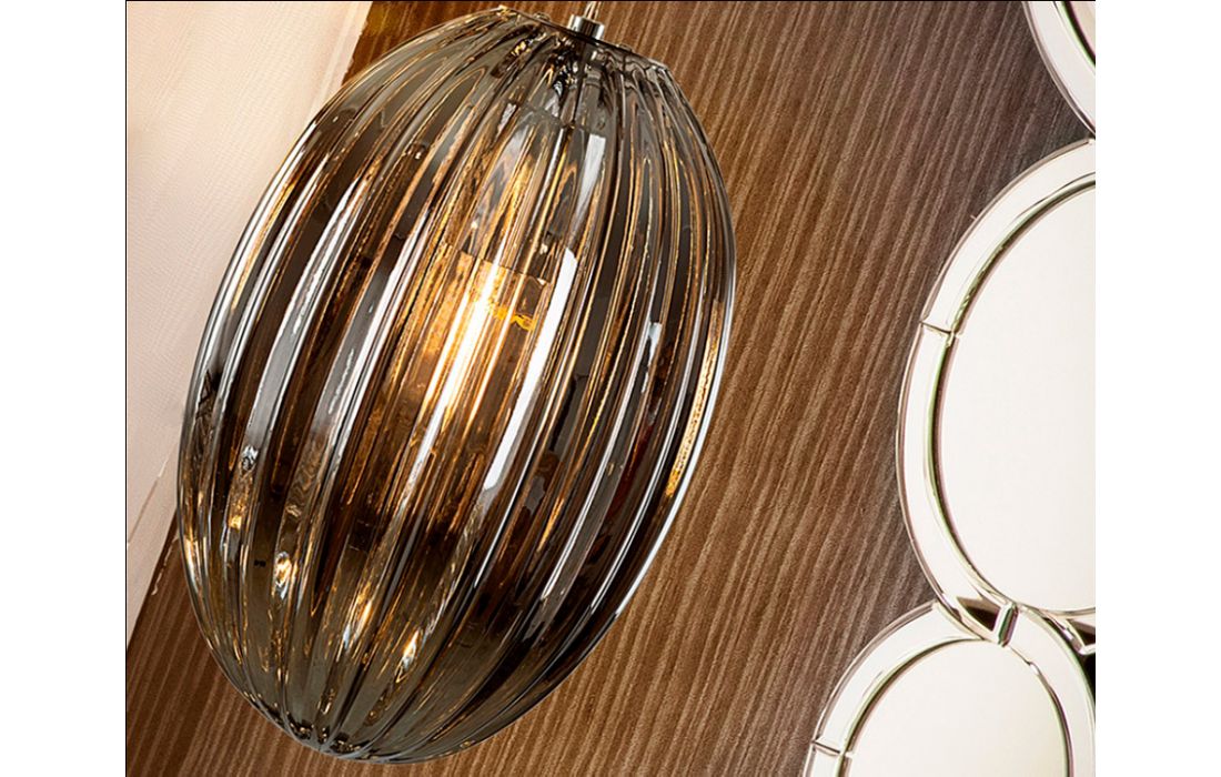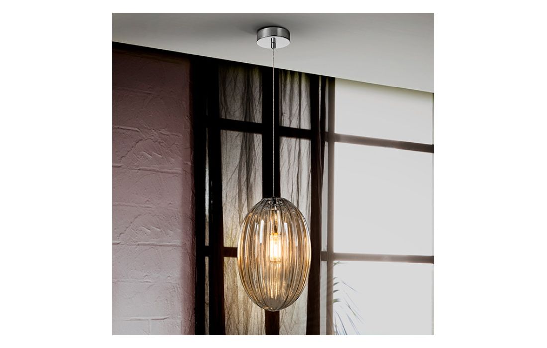 Candeeiro de teto de 1 luz feito em metal acabamento cromodo. Tulipa pequena de dois tons de vidro: conhaque e cinzento smoke espelhado.
