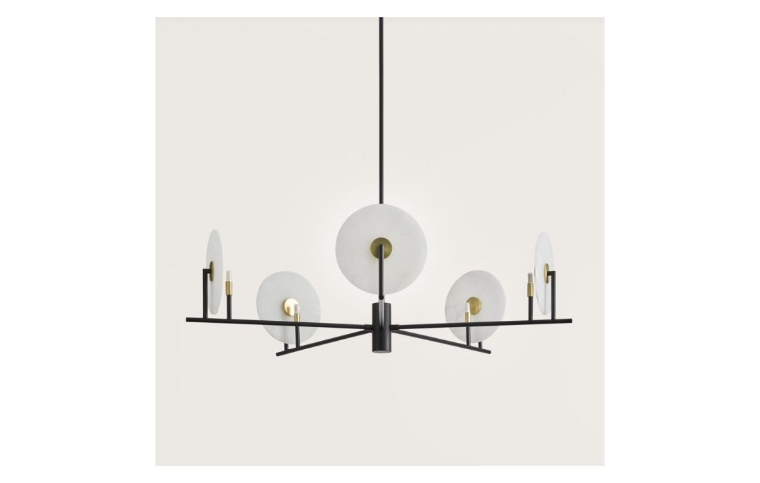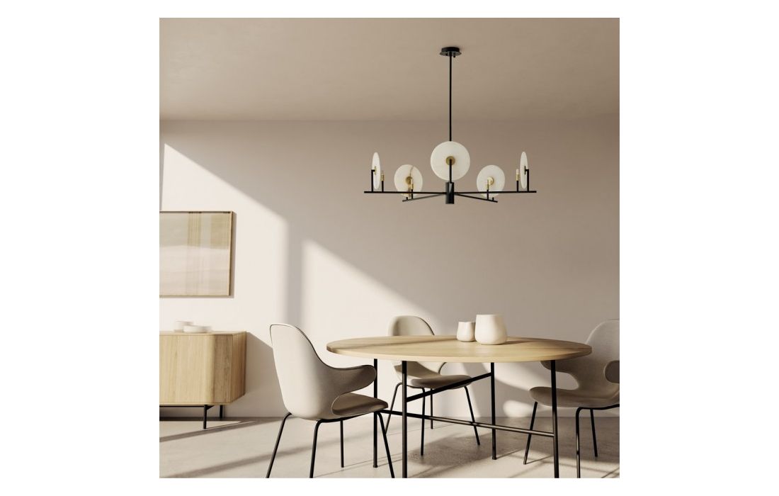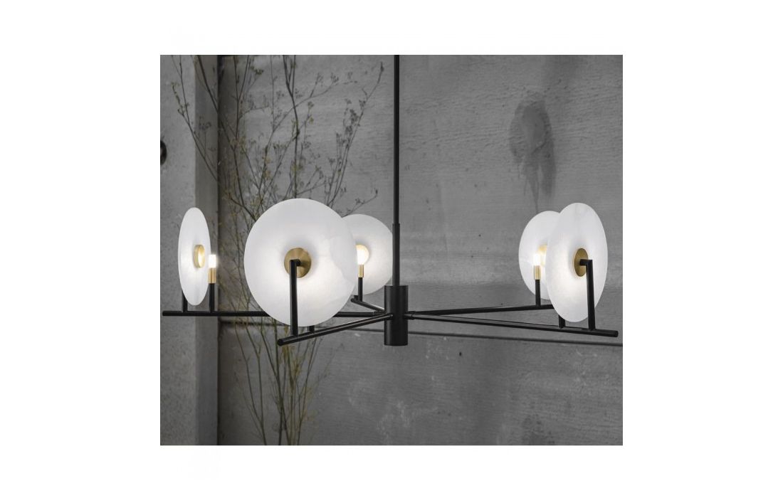 Este candeeiro vai cumprir a missão de fornecer luz ambiente ao seu espaço. A primeira coisa que chama a atenção é o abajur circular feito de cerâmica, localizado sobre uma estrutura de metal preto fosco com detalhes dourados. O Candeeiro de Teto é caracterizado pela sua estrutura em aço e cerâmica.