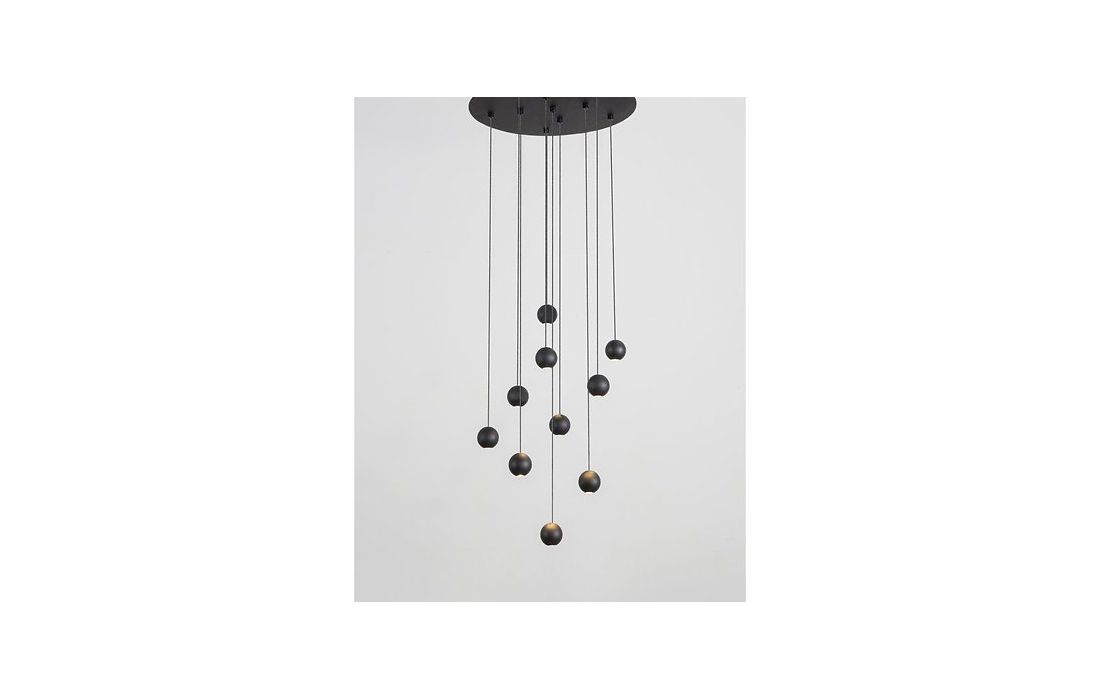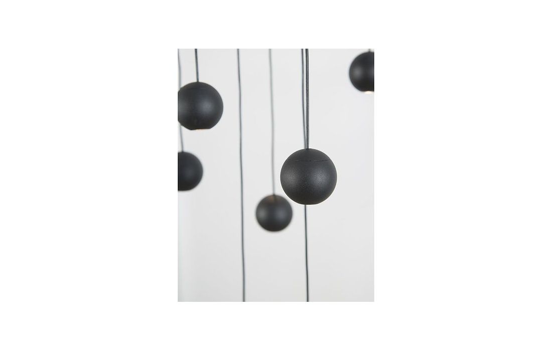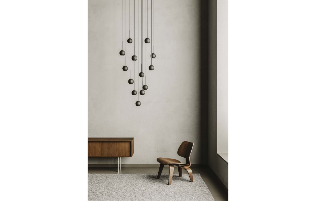 Candeeiro de teto LITA em metal com pontos de luz esféricos em madeira de nogueira, denotando um design rústico e moderno que se destaca do resto da estrutura, sedutor na sua forma de corresponder a qualquer sensação interior.