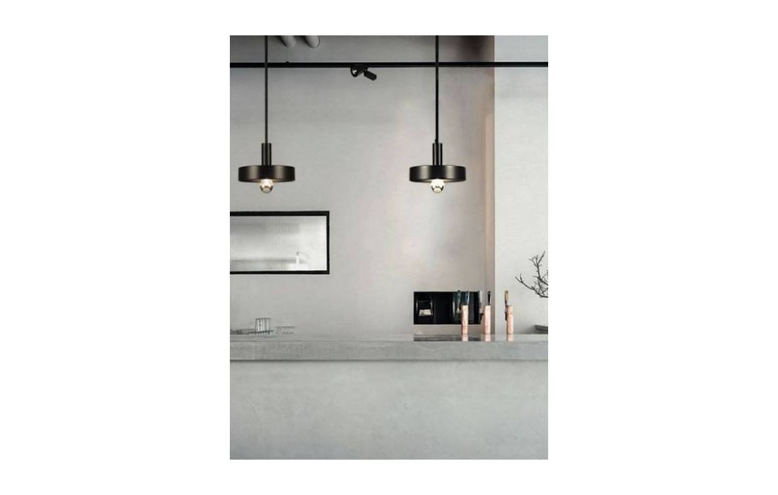 Candeeiro suspenso com o abajur em metal catapulta a luz cria um ambiente sofisticado e diferenciados.
