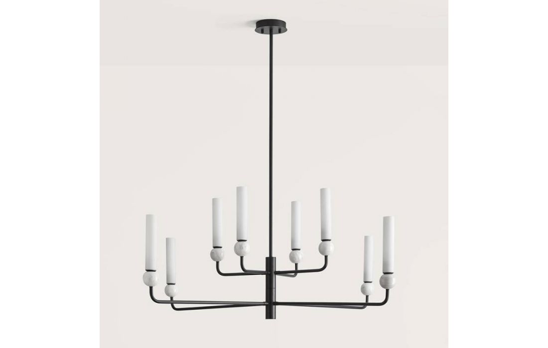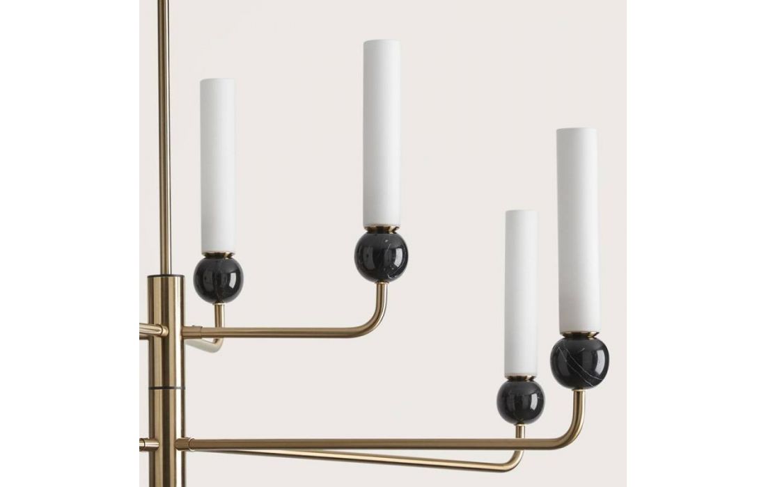 Braço com acabamento em esferas decorativas em mármore e abajur em vidro tubular.