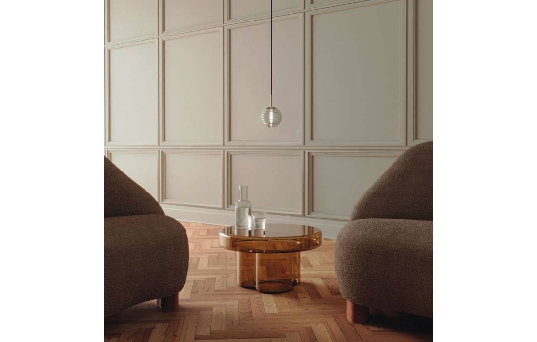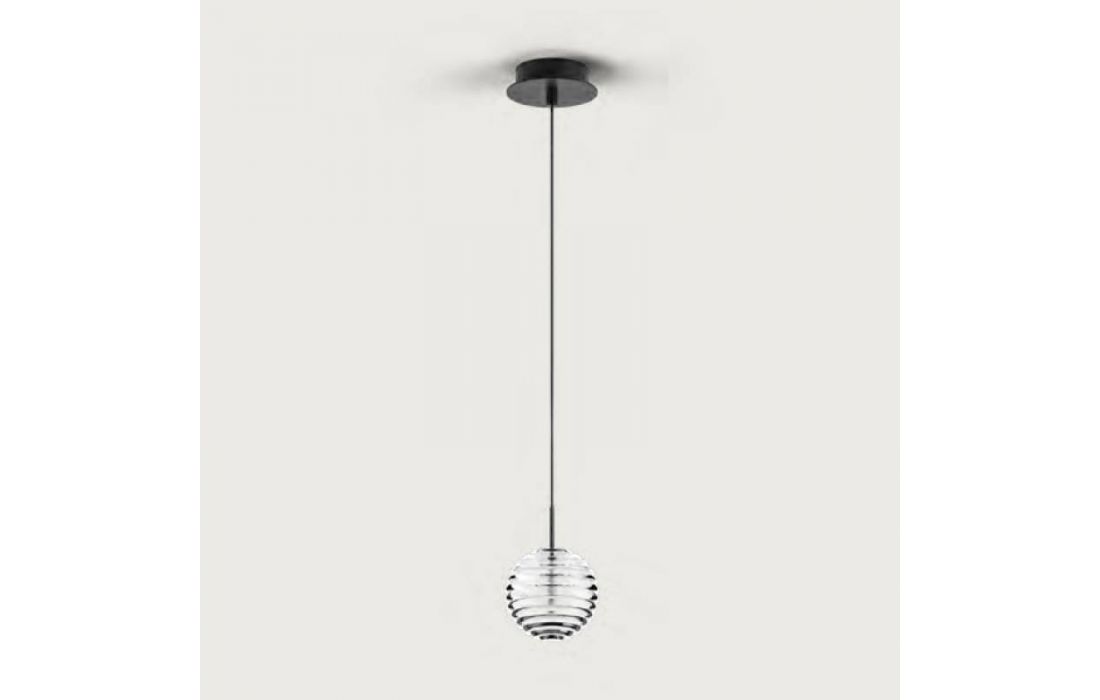 Candeeiro suspenso com um design minimalista, muito elegante e pensado para dar um toque especial a qualquer canto da casa.Com base e detalhe em ouro mate ou aço preto mate e abajur esférico de vidro listrado é elaborado com requinte, criando um efeito que iluminará seu espaço de forma aconchegante.