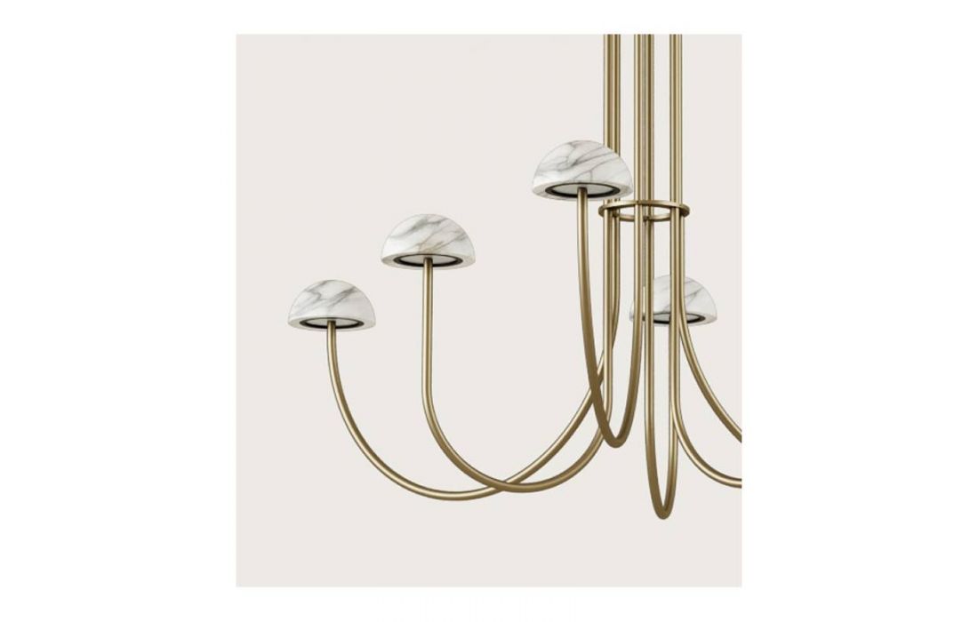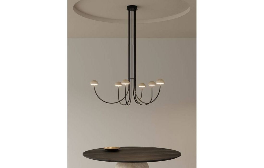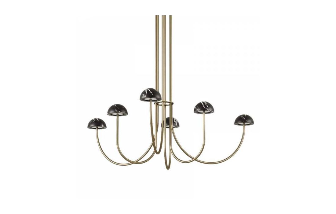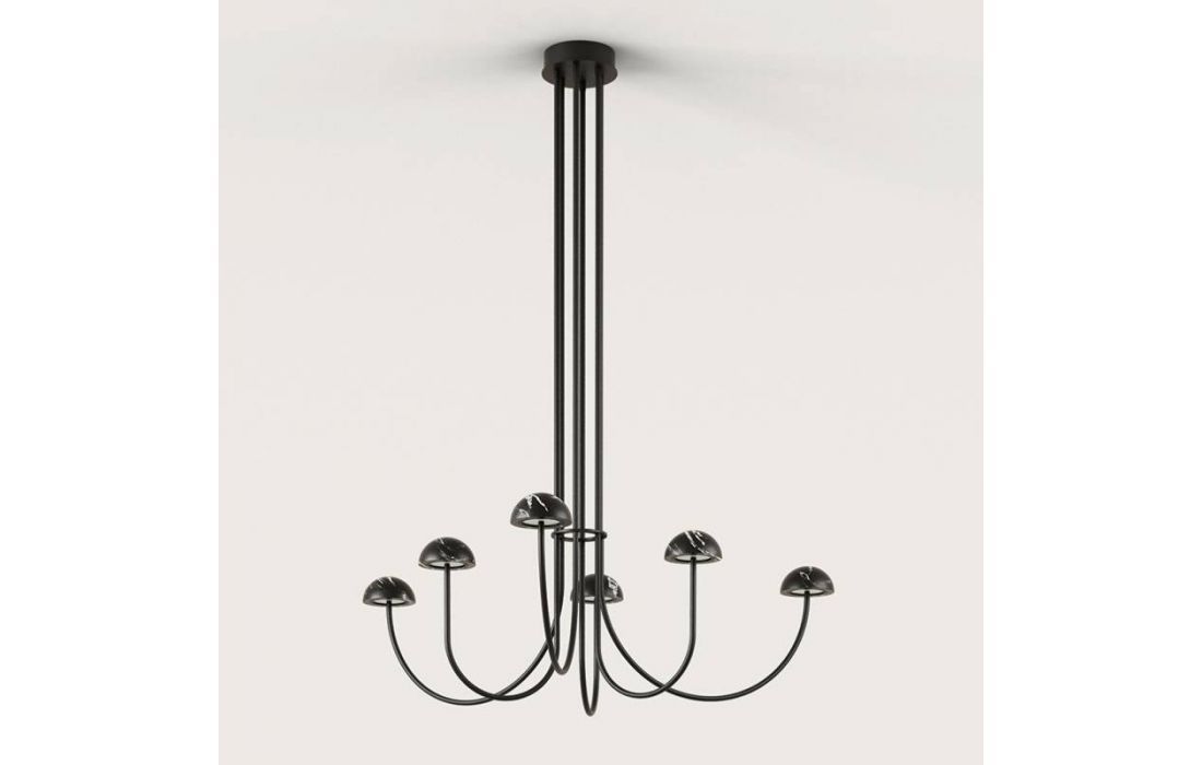 Candeeiro de tecto que transmite uma grande sensação de aconchego, adapta-se perfeitamente a salas de jantar, salas de estar amplas e recepções, com estrutura em aço com 2 acabamentos à escolha: ouro mate ou preto mate e abujures com tonalidades feitas de mármore na cor travertino, branco ou preto.