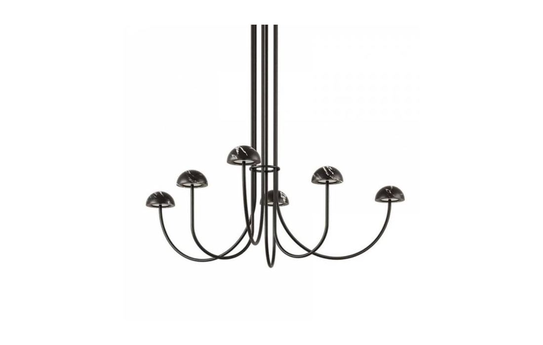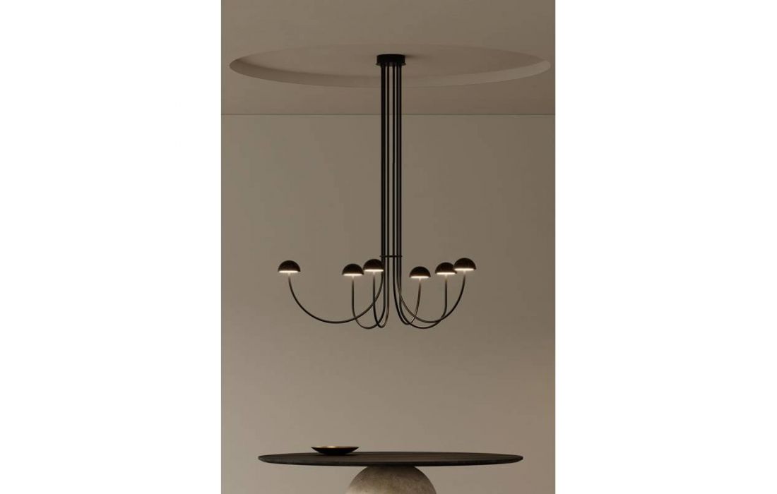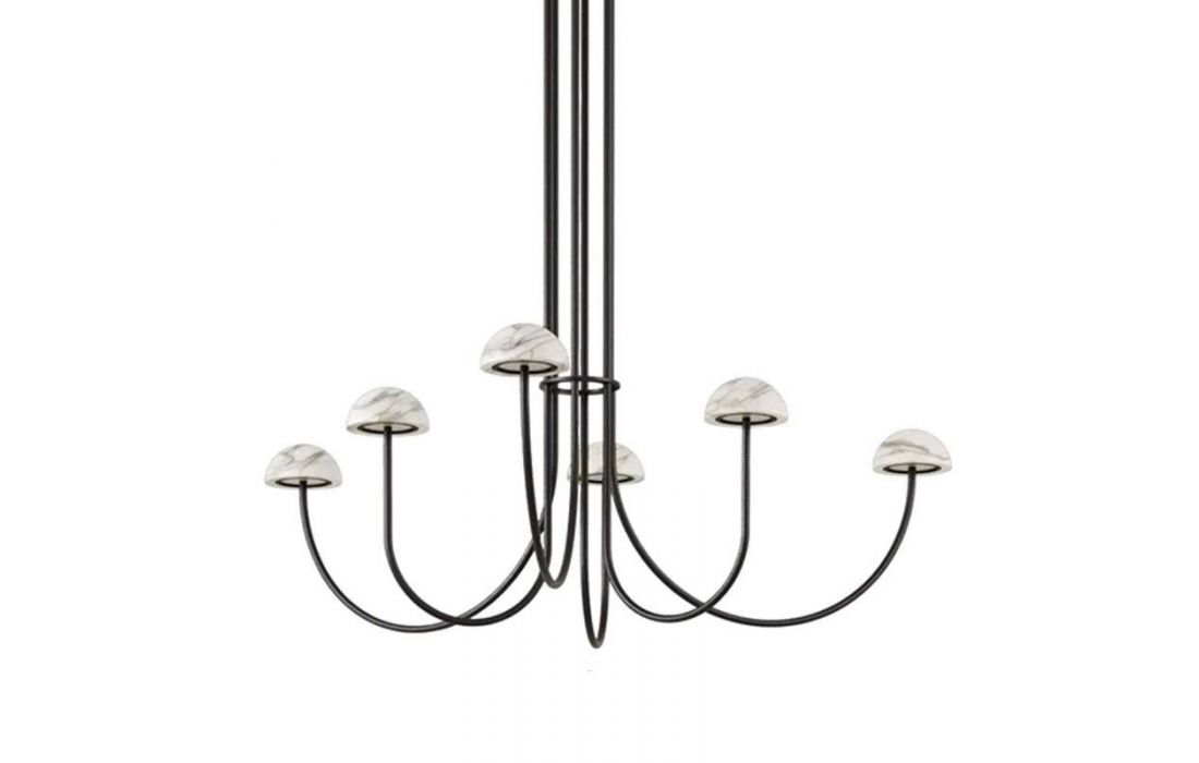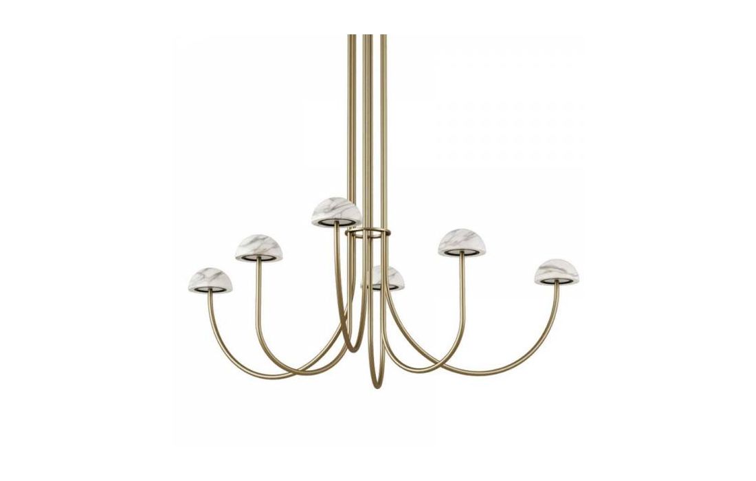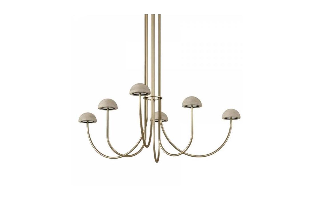 Candeeiro de tecto que transmite uma grande sensação de aconchego, adapta-se perfeitamente a salas de jantar, salas de estar amplas e recepções, com estrutura em aço com 2 acabamentos à escolha: ouro mate ou preto mate e abujures com tonalidades feitas de mármore na cor travertino, branco ou preto.