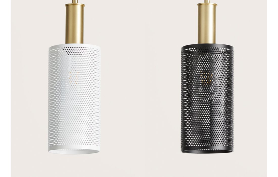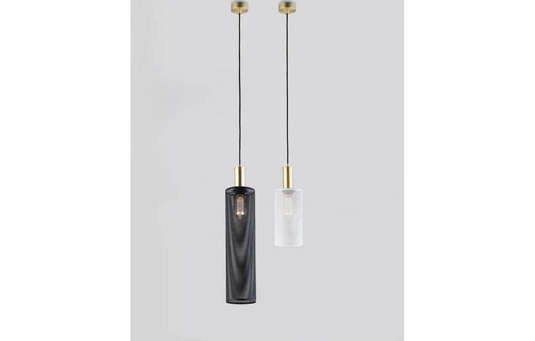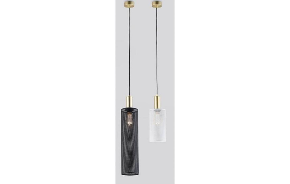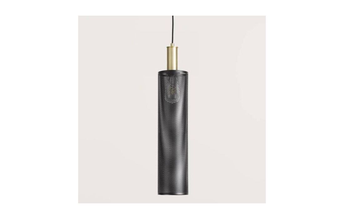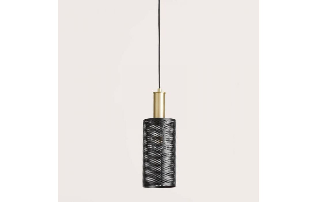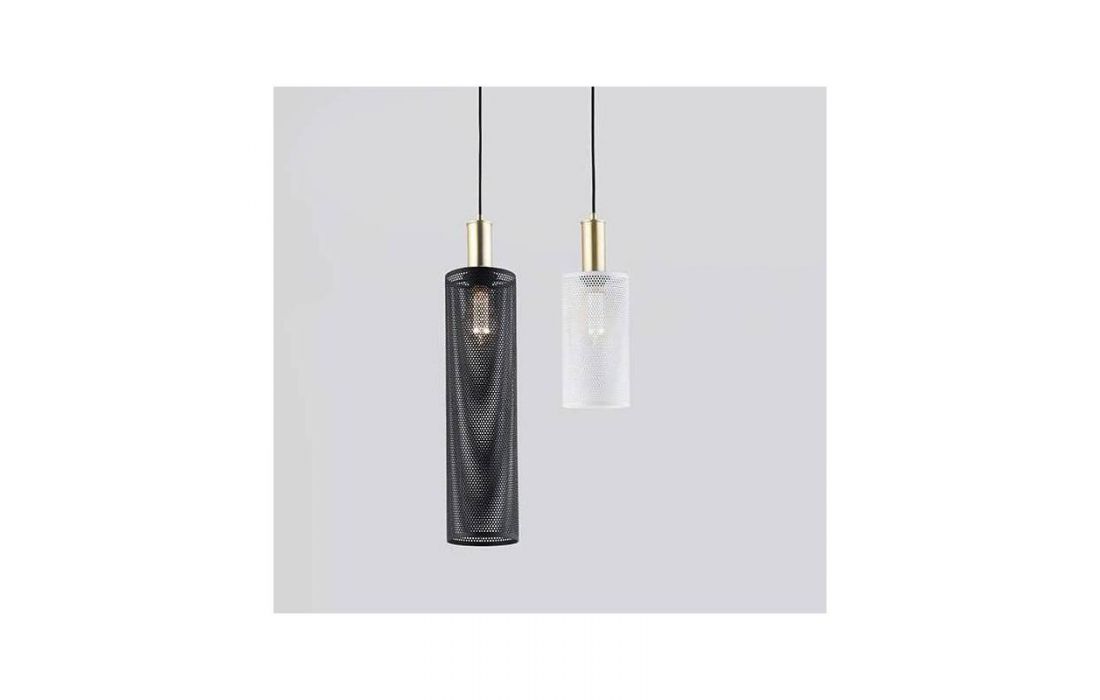 Candeeiro suspenso moderno perfeito para instalação sobre uma mesa de jantar ou bancada de cozinha. Abajur de grelha tubular em aço com um elegante acabamento dourado em combinação com o preto mate da estrutura.
