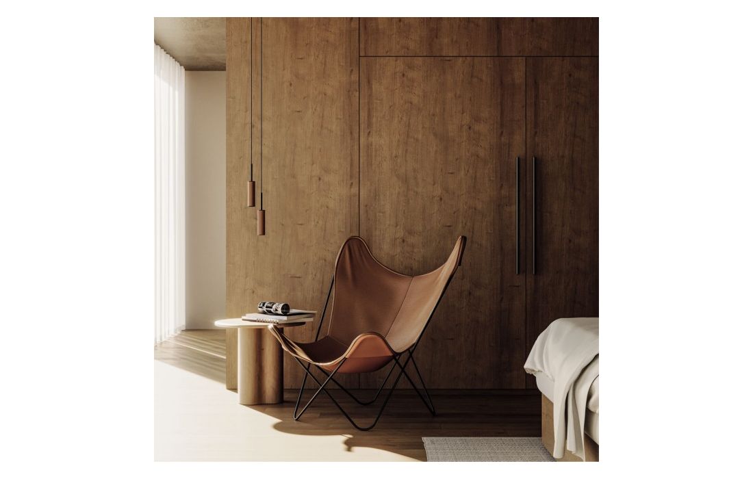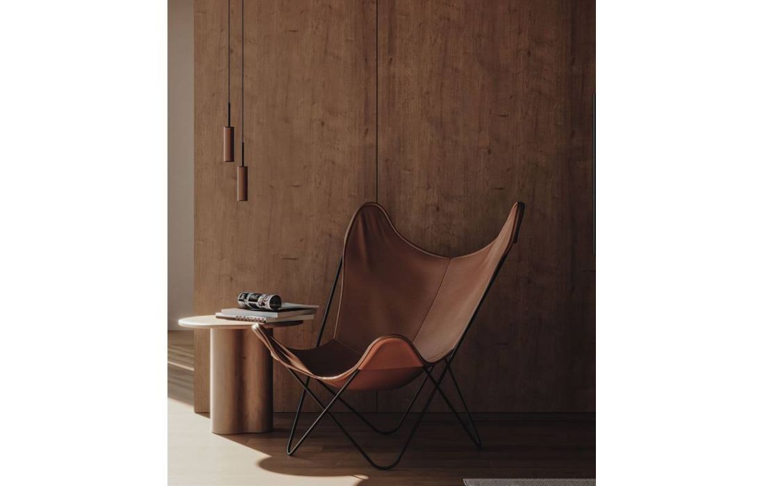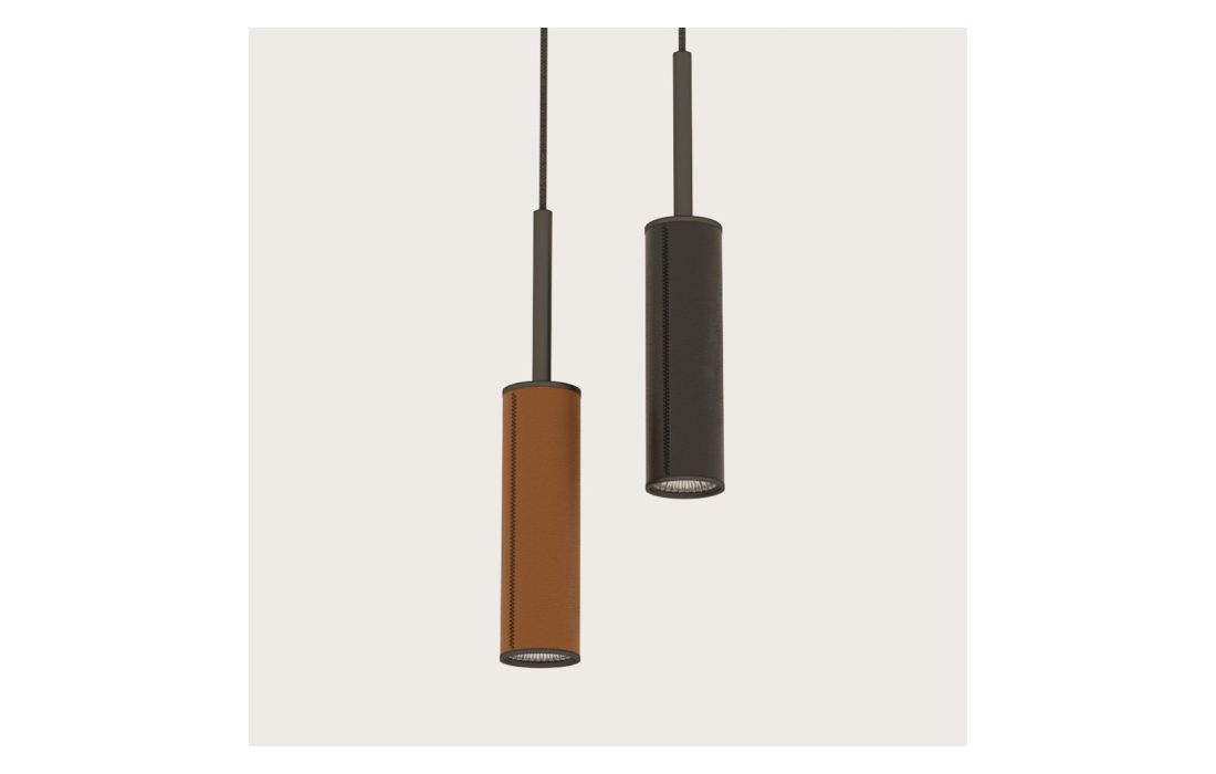 Candeeiro suspenso que se destaca pelo seu design em forma de tubo e pela combinação de materiais com que é fabricado. O design convencional deste tipo de iluminação evolui, resultando num candeeiro de elevado nível estético.Base metálica pintada de preto com tubo têxtil coberto em couro castanho ou preto.