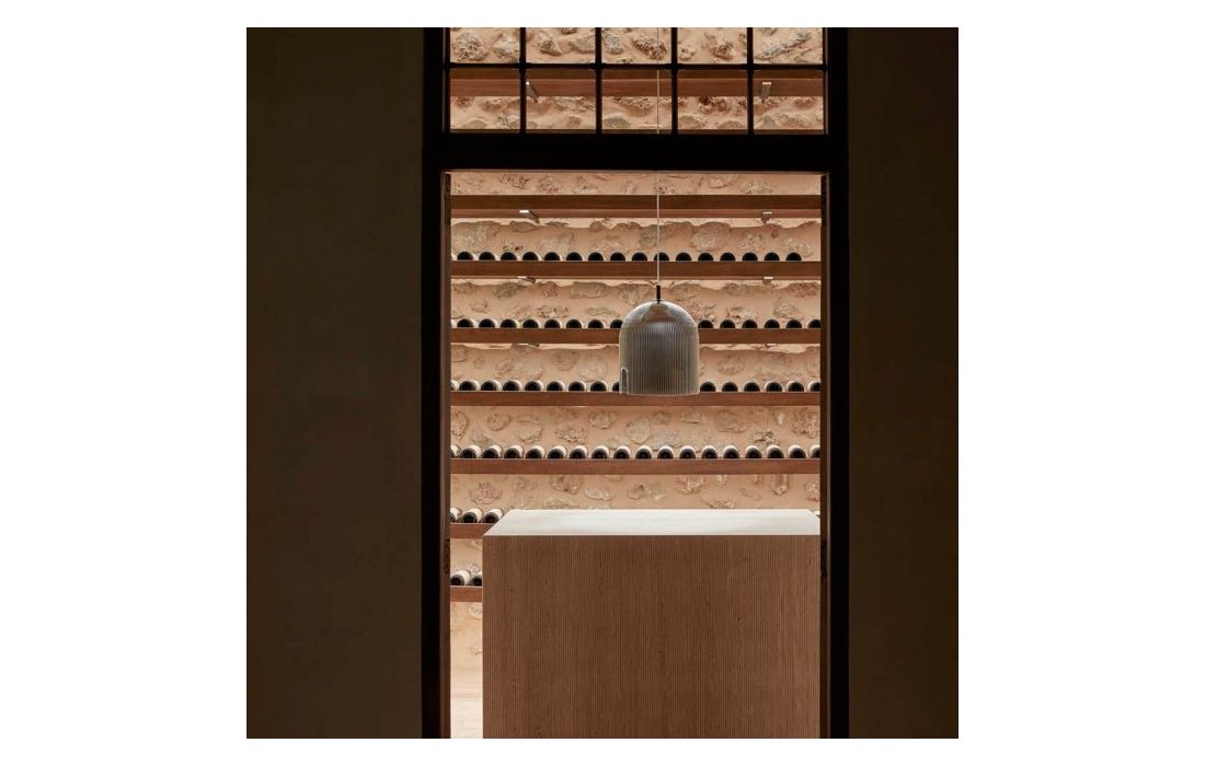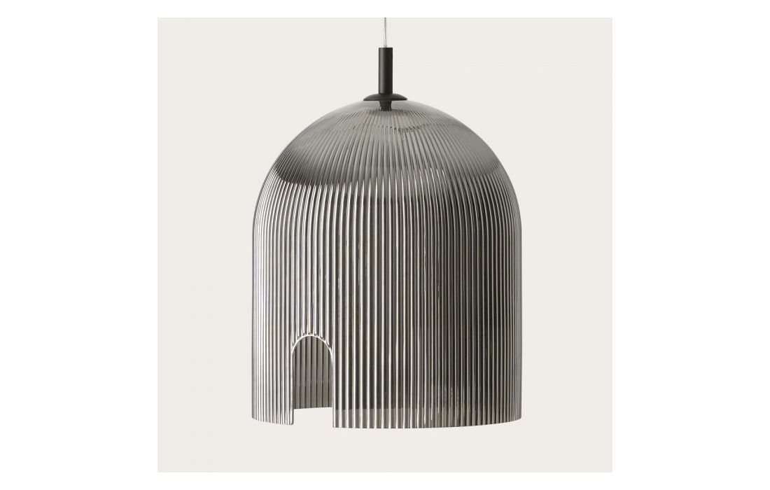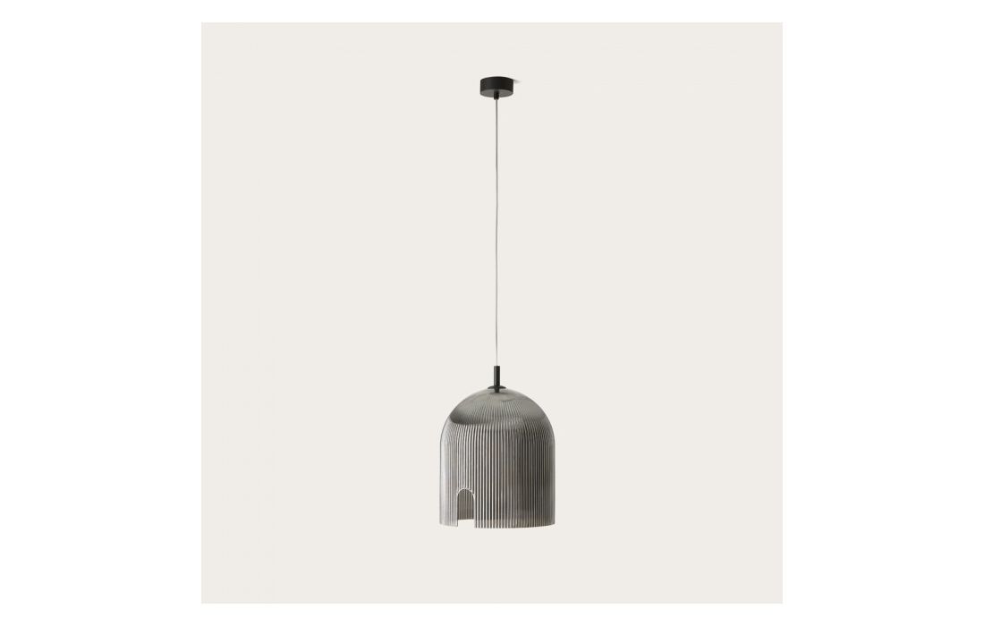 Candeeiro suspenso com abajur de vidro canelado. A luz LED é emitida de dentro do abajur para criar uma iluminação ambiente suave. O seu design em cúpula, aberto na parte inferior, permite iluminar mesas, balcões e bancadas. Abajur de vidro com acabamento cinza fumê.