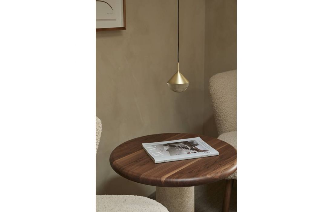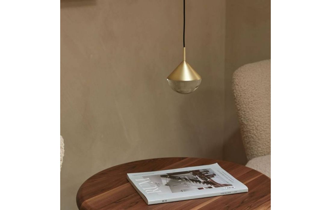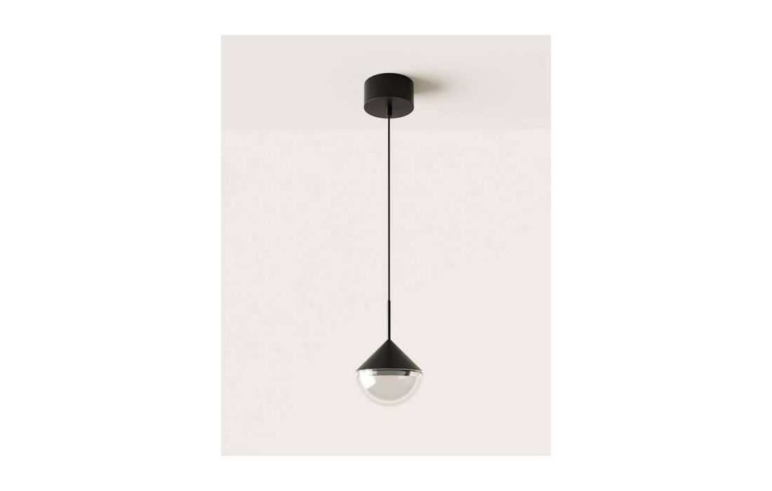 Candeeiro suspenso de design elegante, de linhas puras e marcantes. Uma mistura impressionante de materiais que dão origem a uma peça de assinatura, com difusor de luz em vidro ótico transparente com base em mármore preto ou em ouro mate.