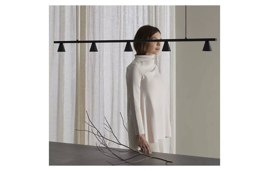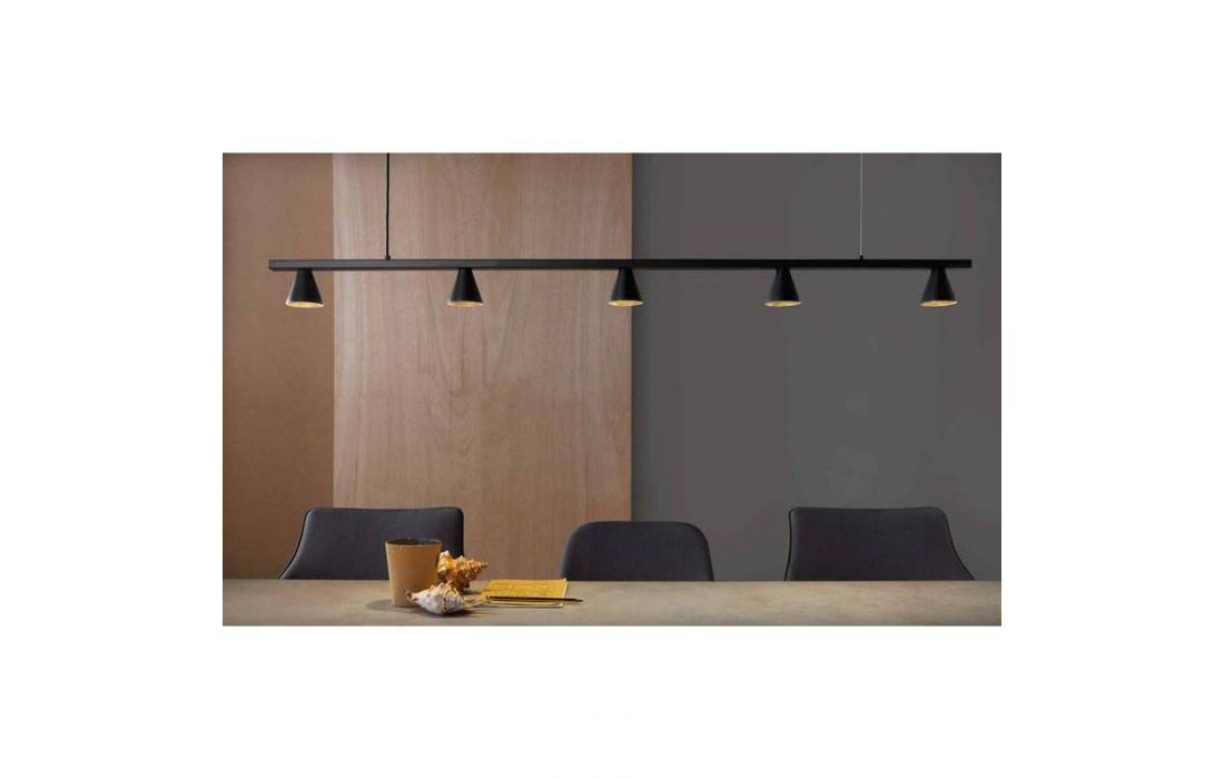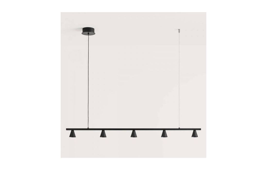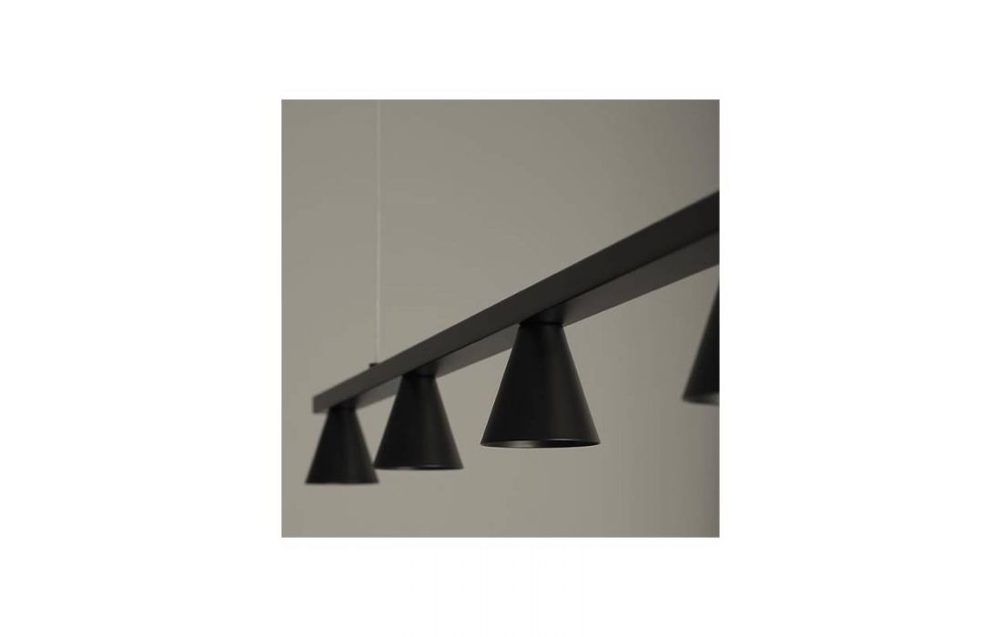 Candeeiro suspenso de design estilizado e leve, um conceito atraente concebido para projetar a luz para baixo e iluminar adequadamente superfícies horizontais como mesas de jantar ou balcões de cozinha . Fabricado em metal de alta qualidade e encimado por pequenos "copos" metálicos da mesma cor do resto do candeeiro.