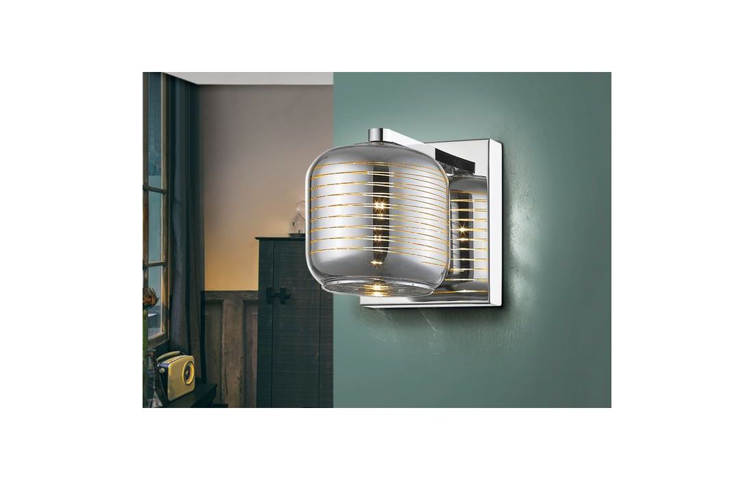 Candeeiro de parede de 1 luz em metal acabamento crómio. Tulipa de vidro espelhado com padrão de linhas transparentes.