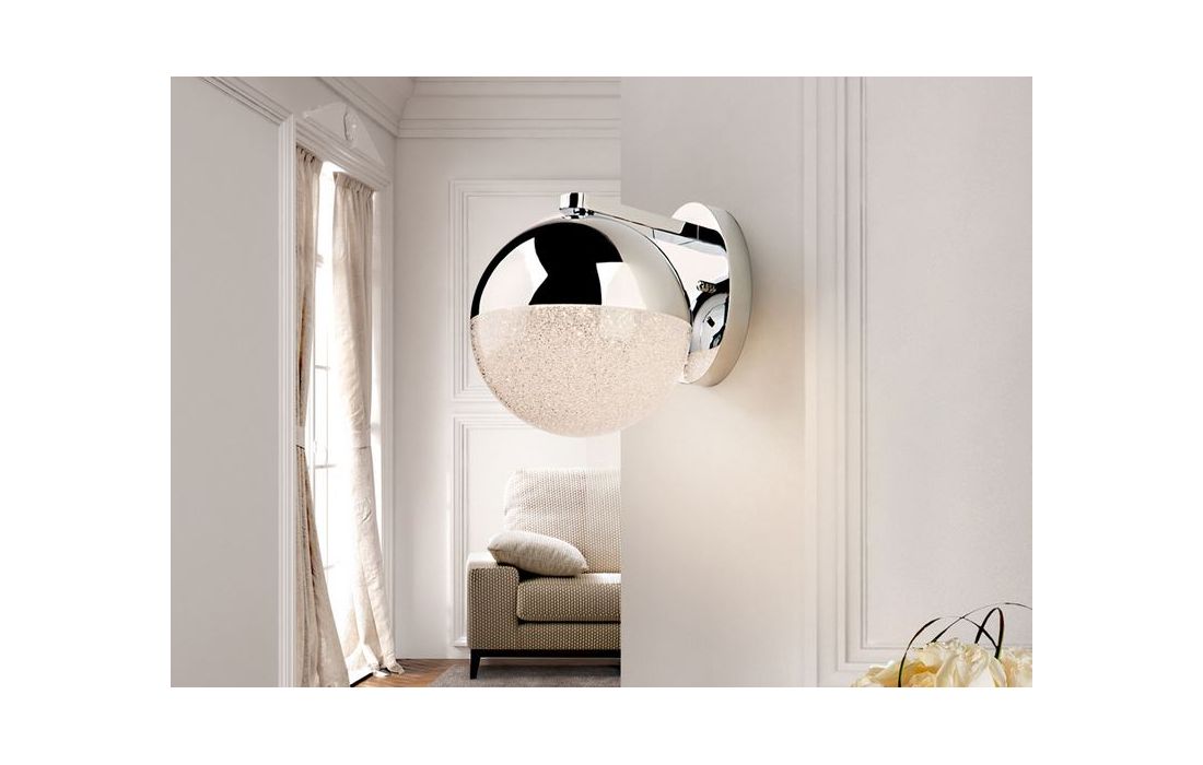 Candeeiro de parede de 1 luz em metal, acabamento crómio. Tulipa esférica de de metal e policarbonato com interior texturizado.