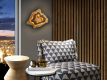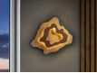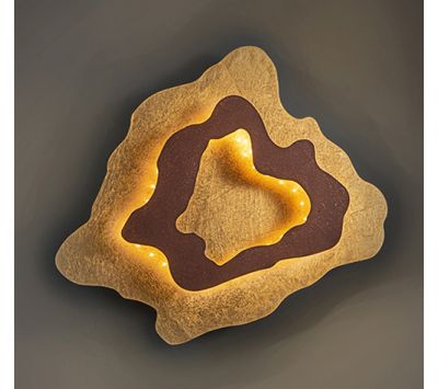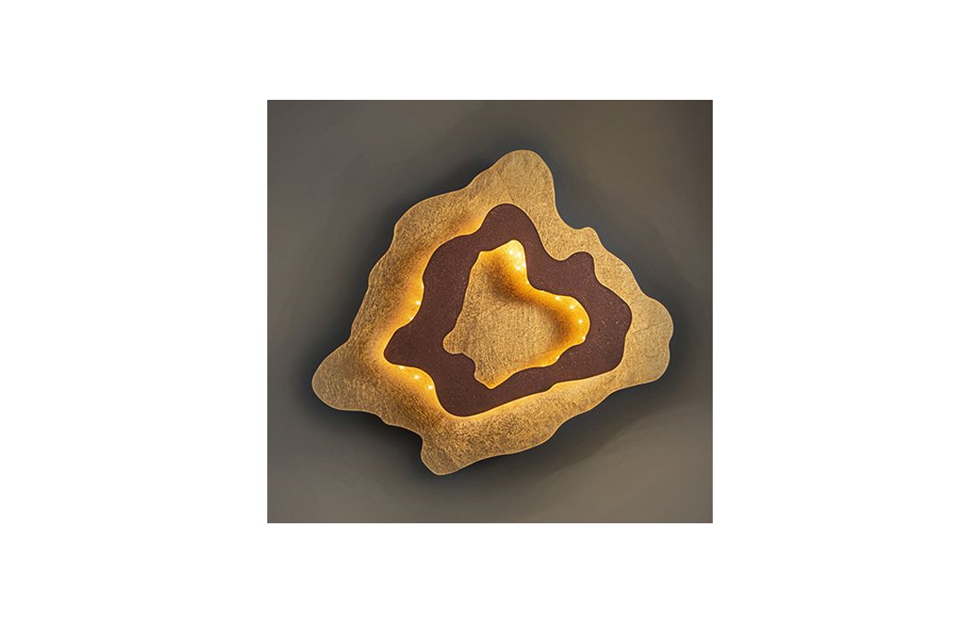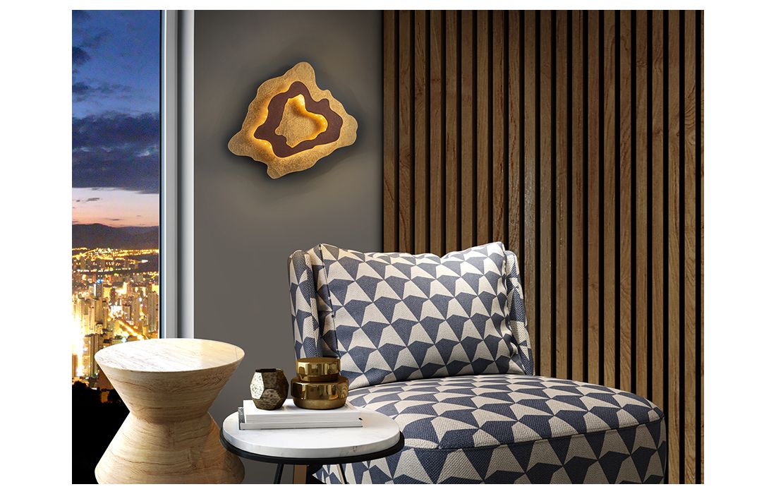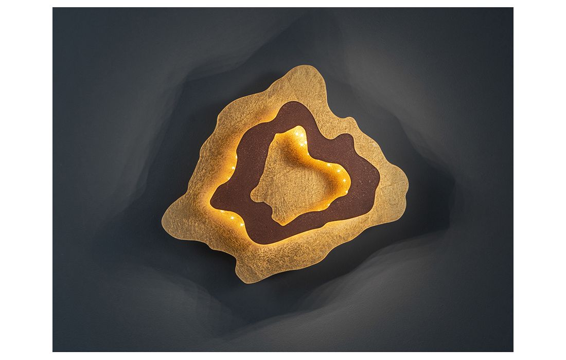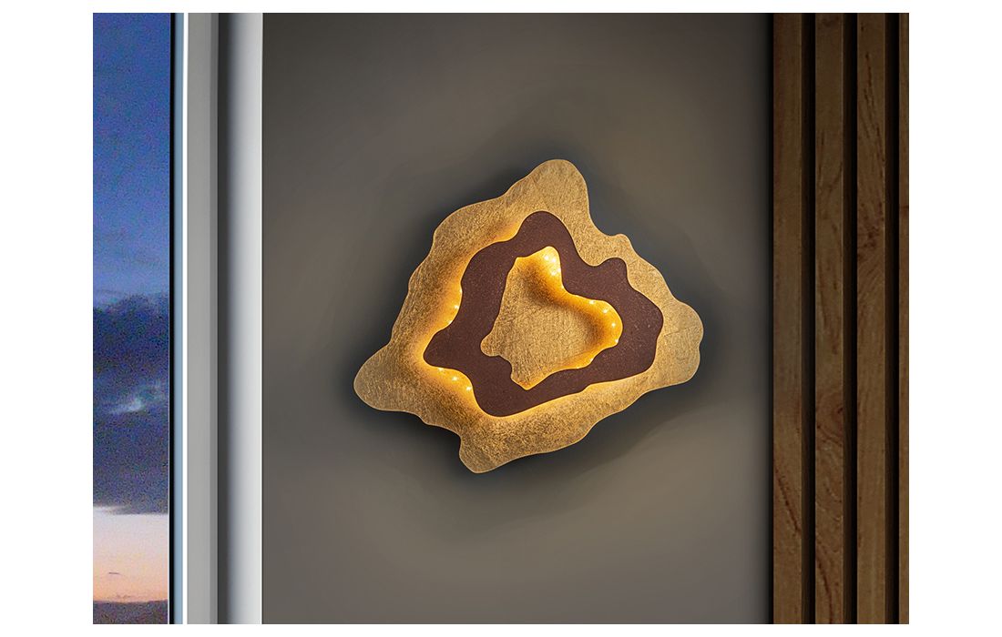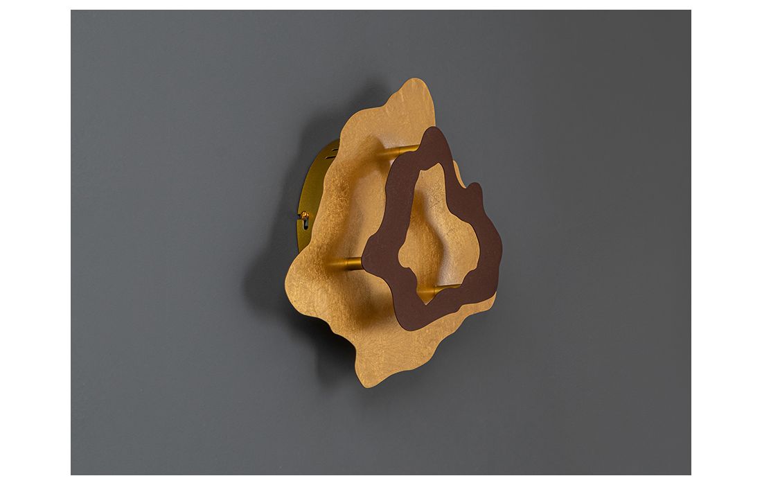 Candeeiro de parede em metal com acabamento em folha de ouro e aço cor castanho óxido.