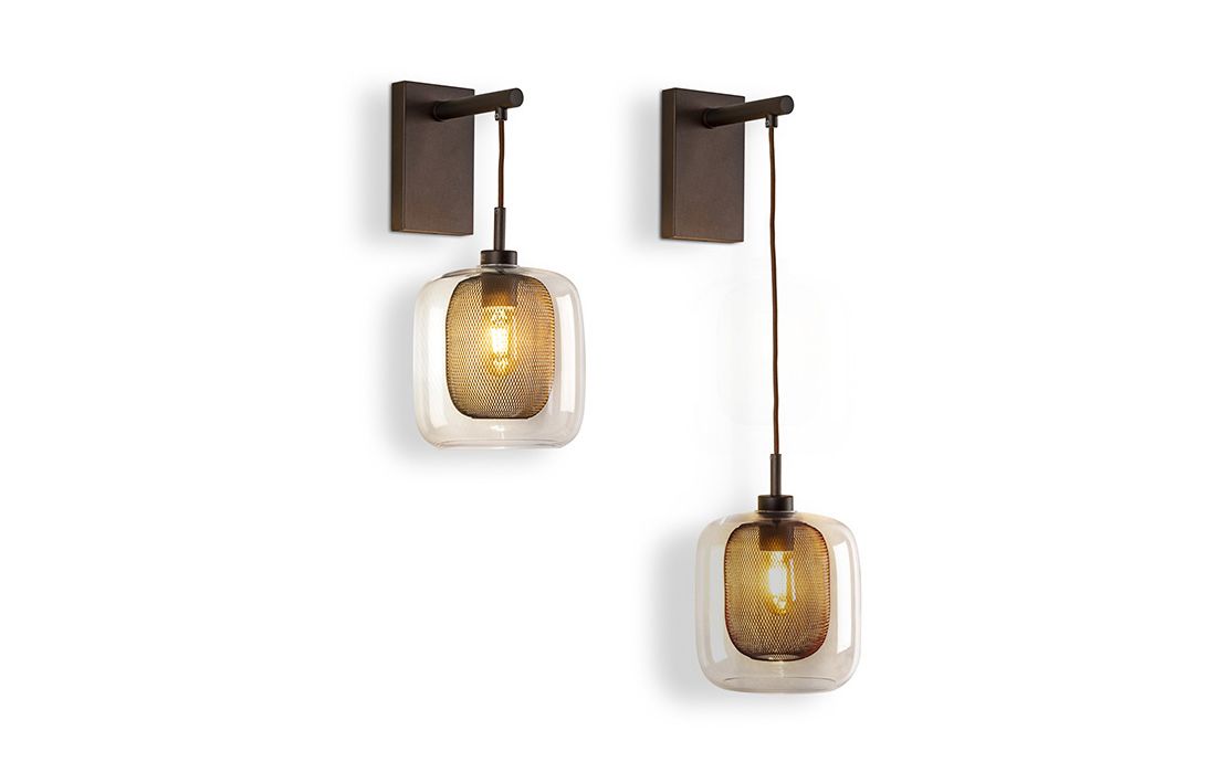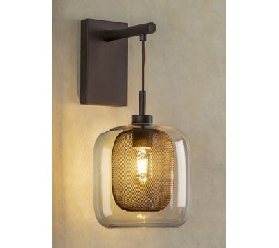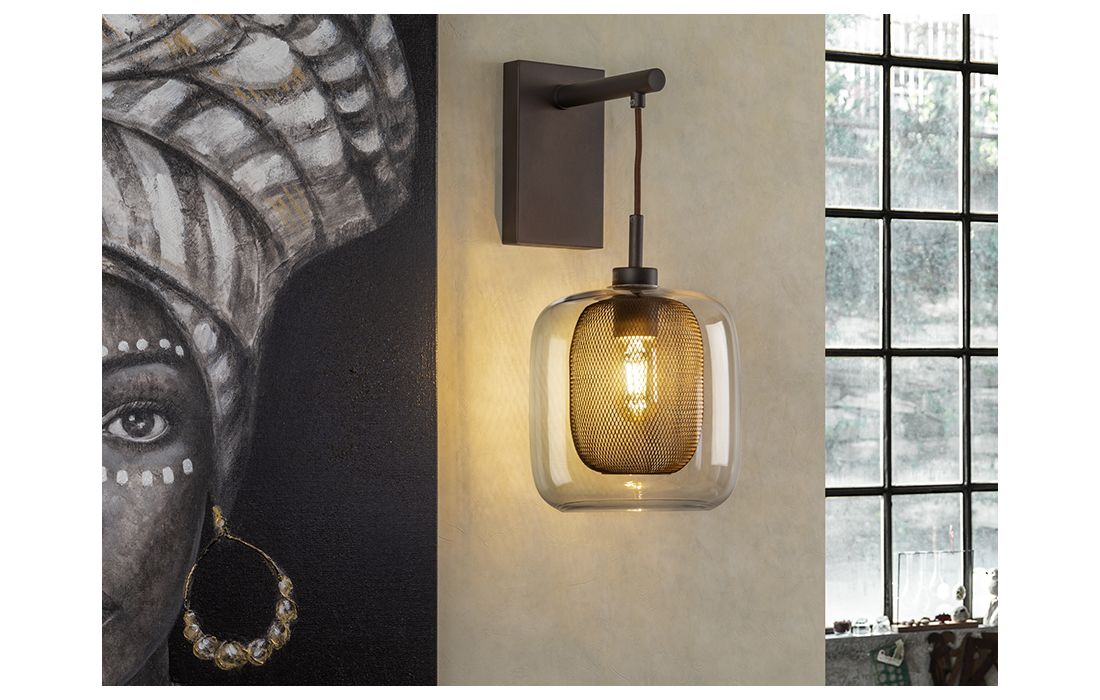 Candeeiro de parede de 1 luz em metal lacado, cor chocolate, dupla tulipa, interior de rede metálica e exterior de vidro.