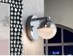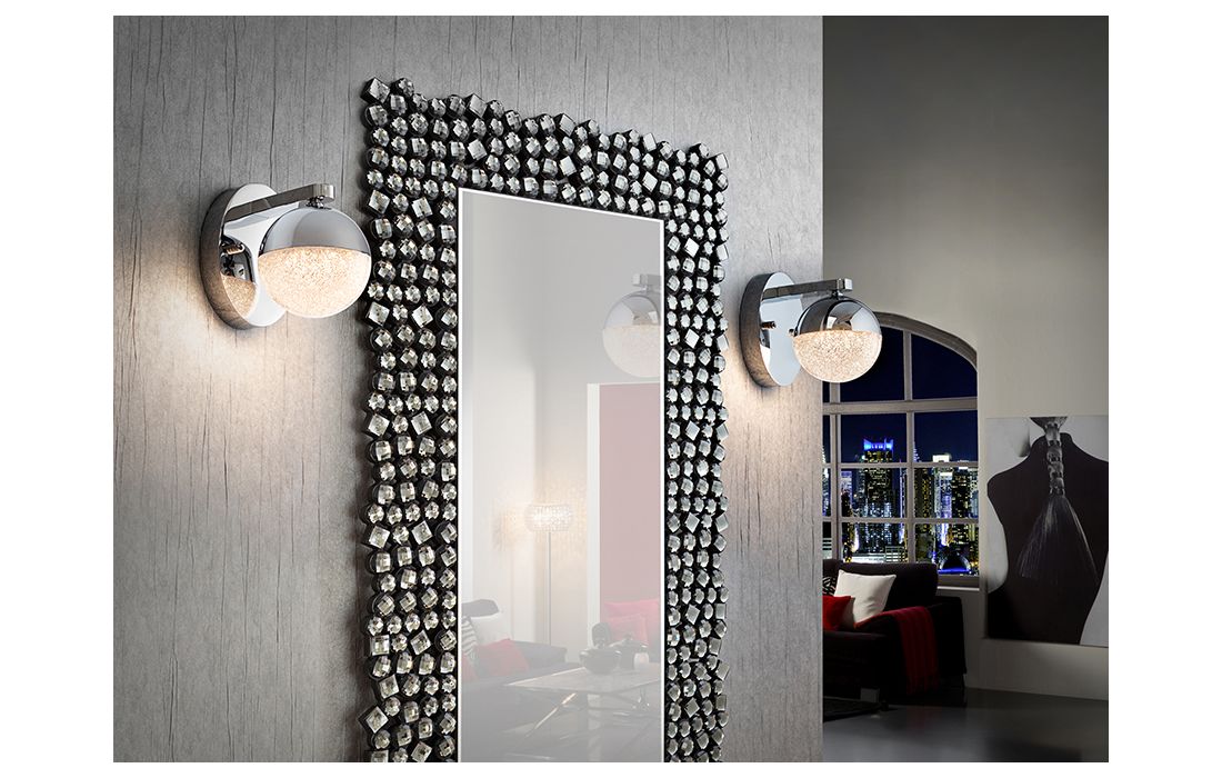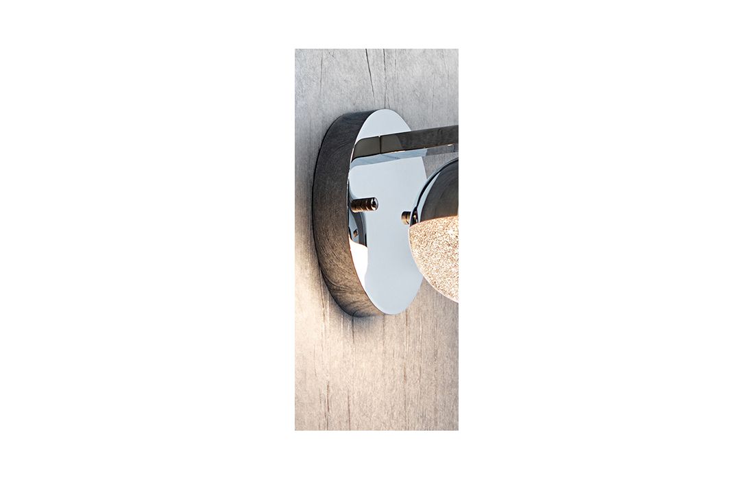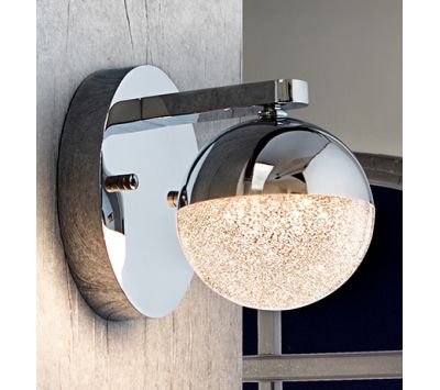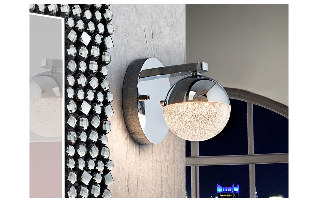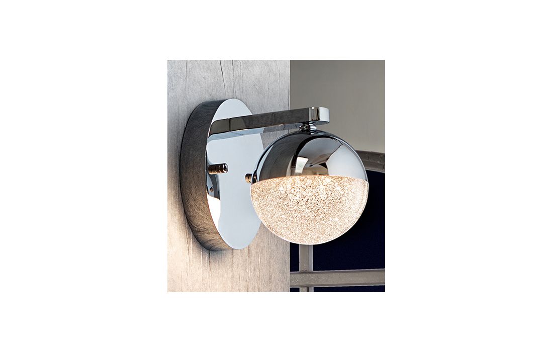 Candeeiro de parede de 1 luz LED realizado em metal, acabamento crómio. Tulipa esférica de Ø12 cm de policarbonato com interior texturizado e metal cromado.