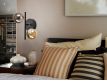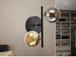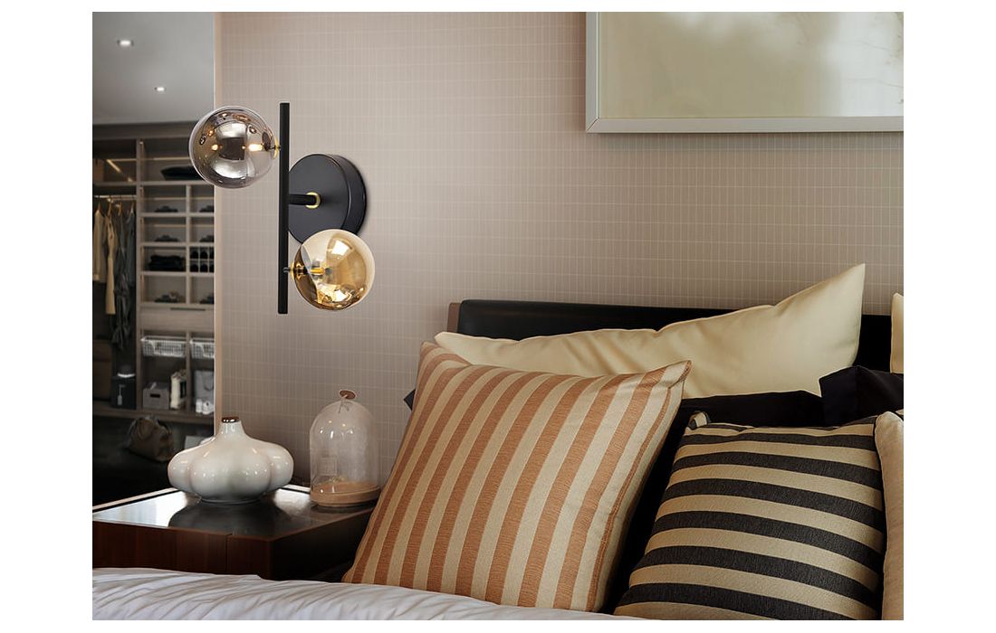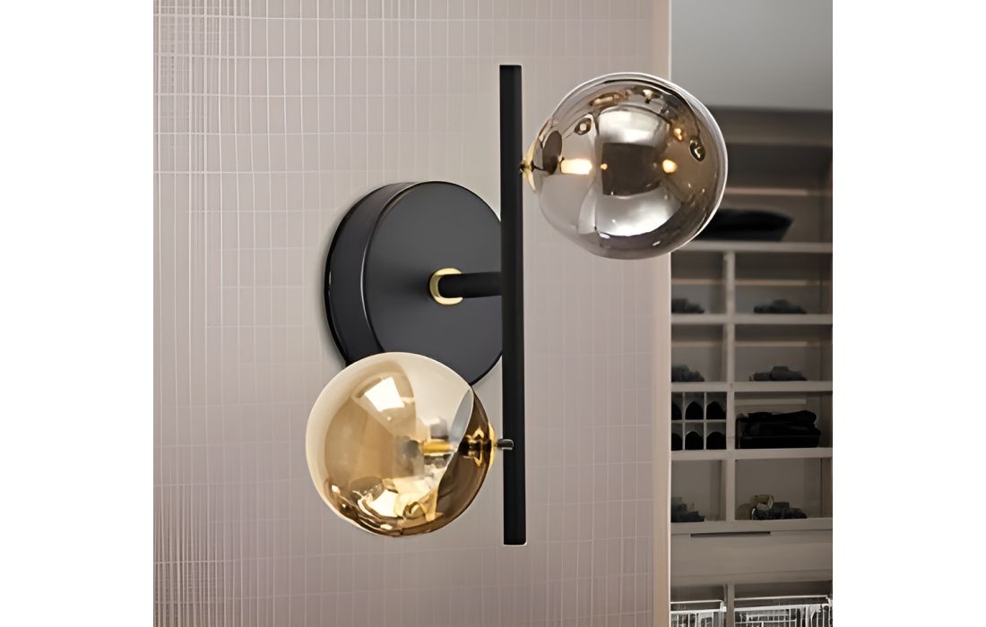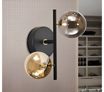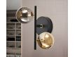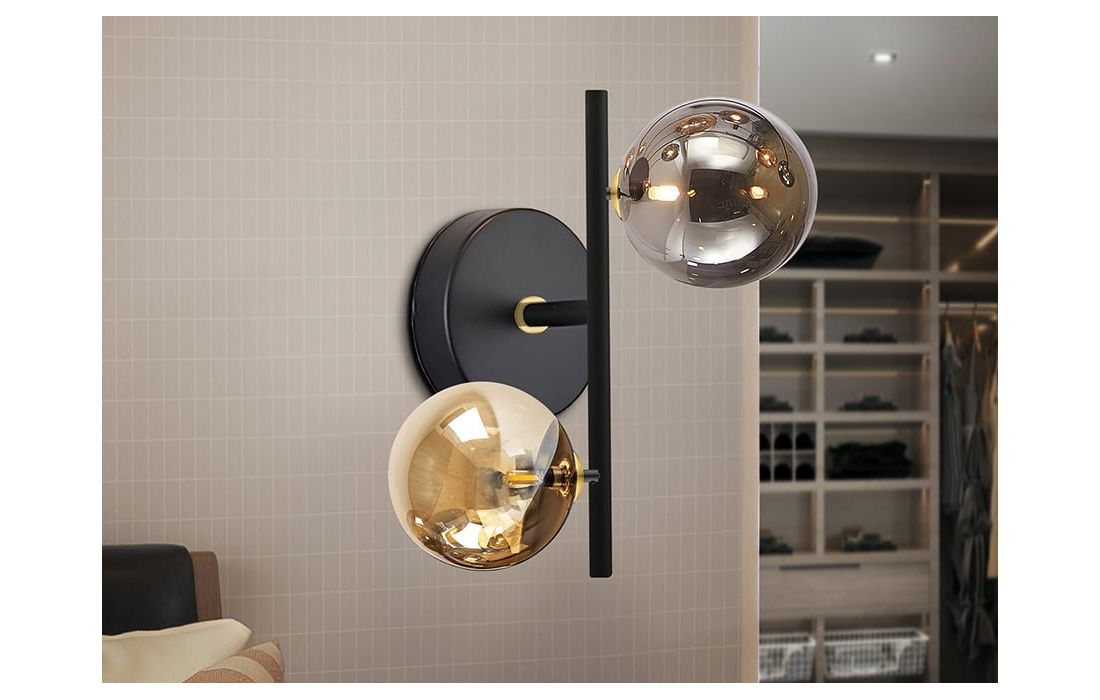 Candeeiro de parede de 2 luzes realizado em metal com acabamento preto mate, detalhe de latão acetinado. Abajures de vidro esférico âmbar e smoke de 12 cm.