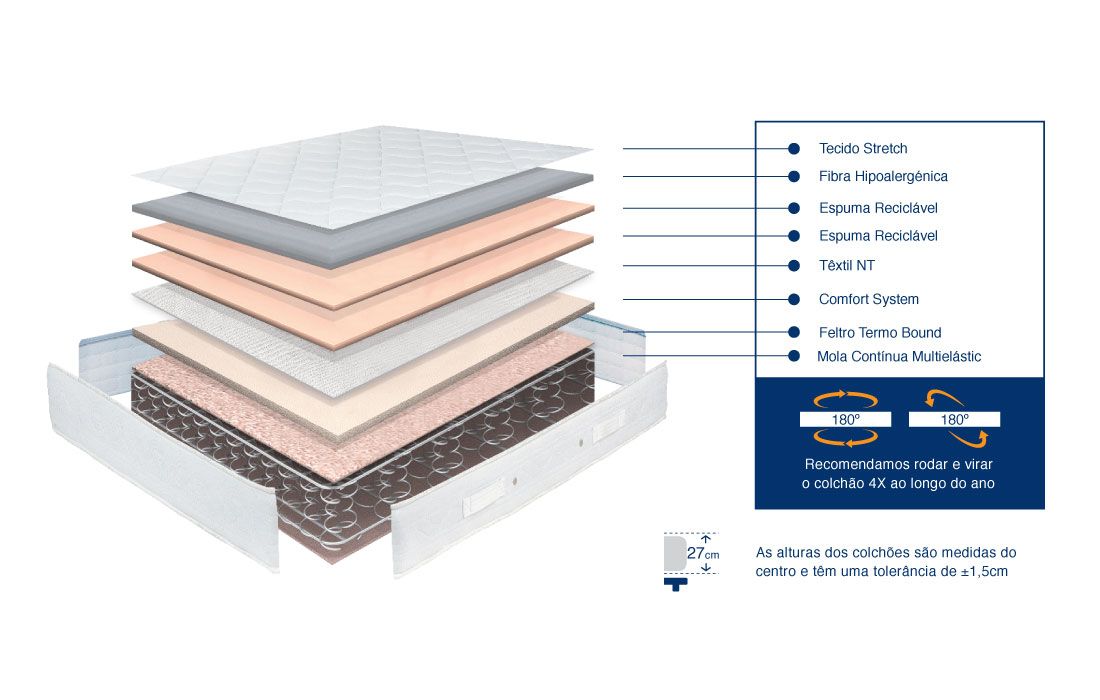 Garanta um apoio firme durante o sono, enquanto cuida da sua saúde, prevenindo-se de alergias graças ao revestimento em tecido Stretch.