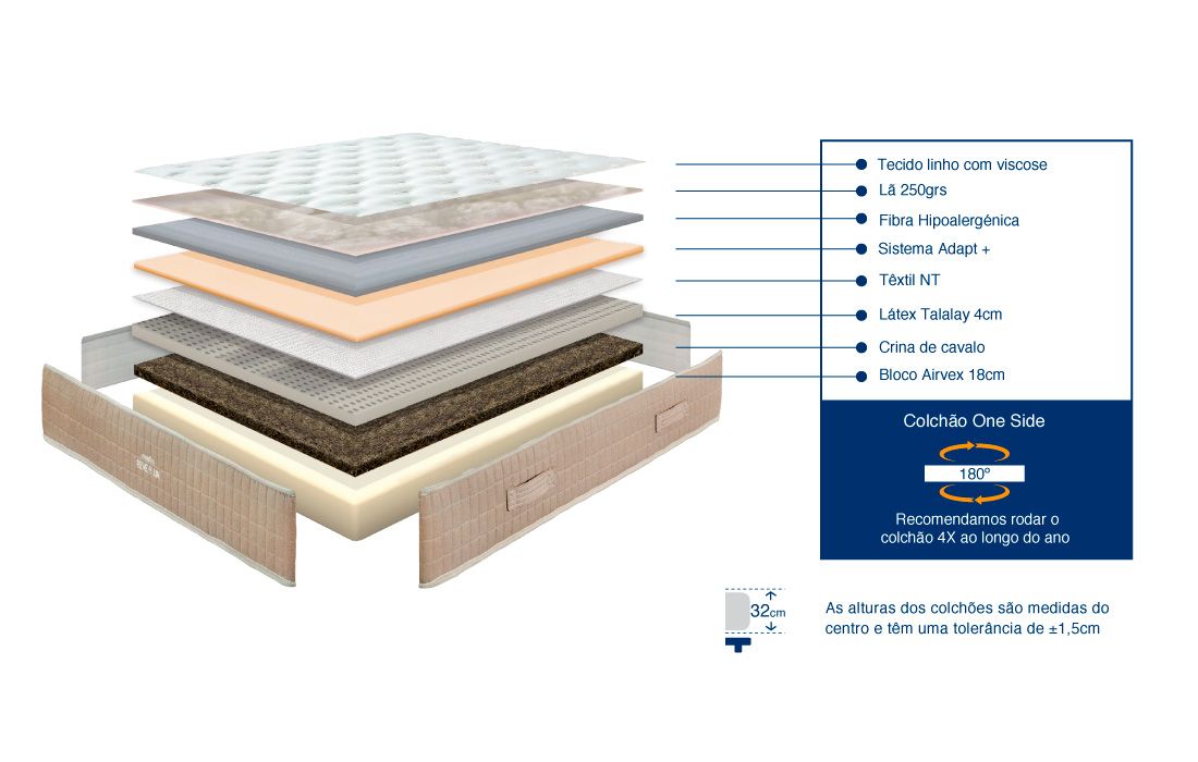 Um material natural que oferece o máximo conforto. Regula a temperatura, isolando o calor e protegendo do frio, a crina de cavalo comporta-se como um climatizador natural, Garante maior durabilidade e comodidade ao colchão.