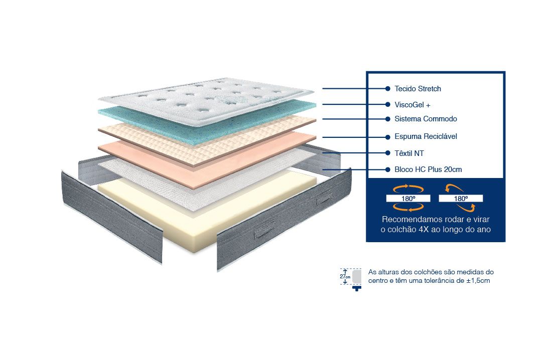Elevado nível de adaptabilidade graças ao enchimento em ViscoGel, que proporciona uma camada de extra conforto e um apoio ao corpo suave e fresco.
