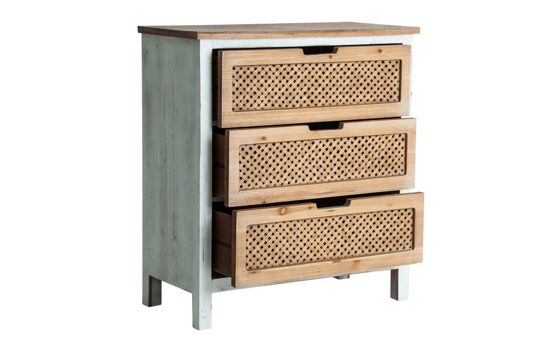 Cómoda feita de madeira de abeto natural e branco e é composto por três gavetas com estrutura de grade na frente