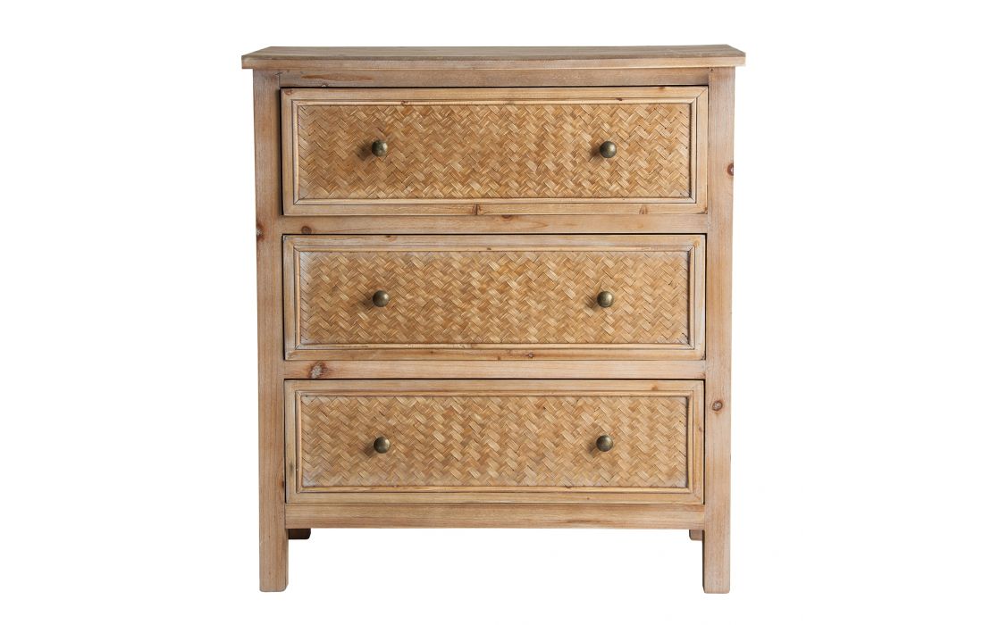 Cómoda feita de madeira de abeto combinada com madeira de MDF, é composto por três gavetas com estrutura de bambu