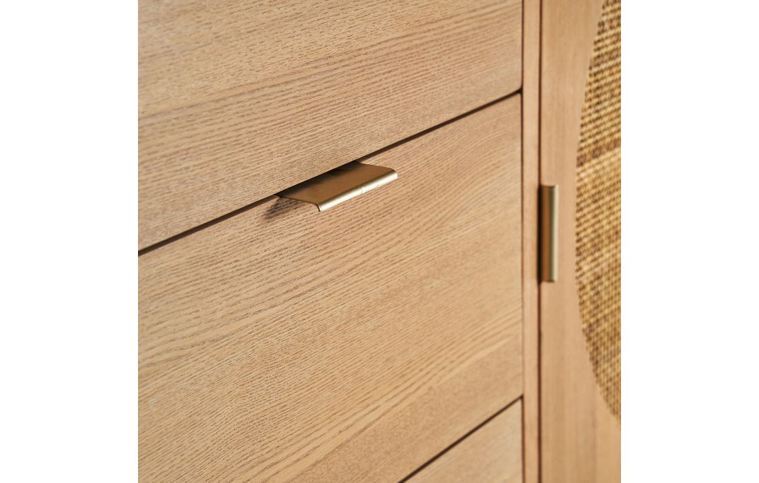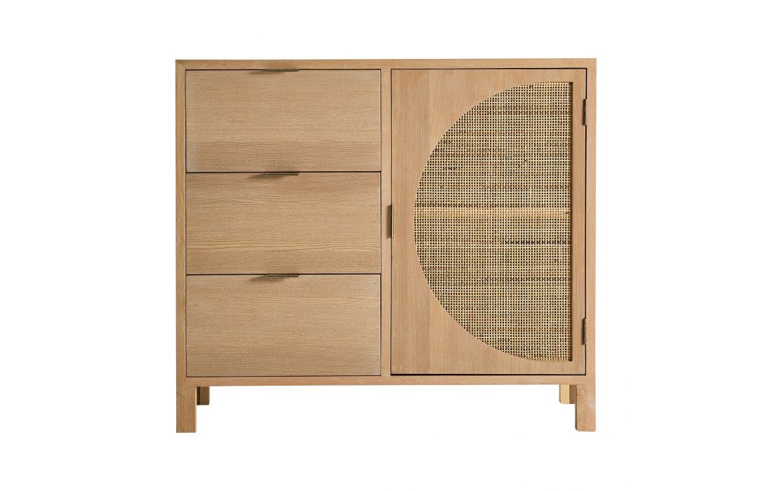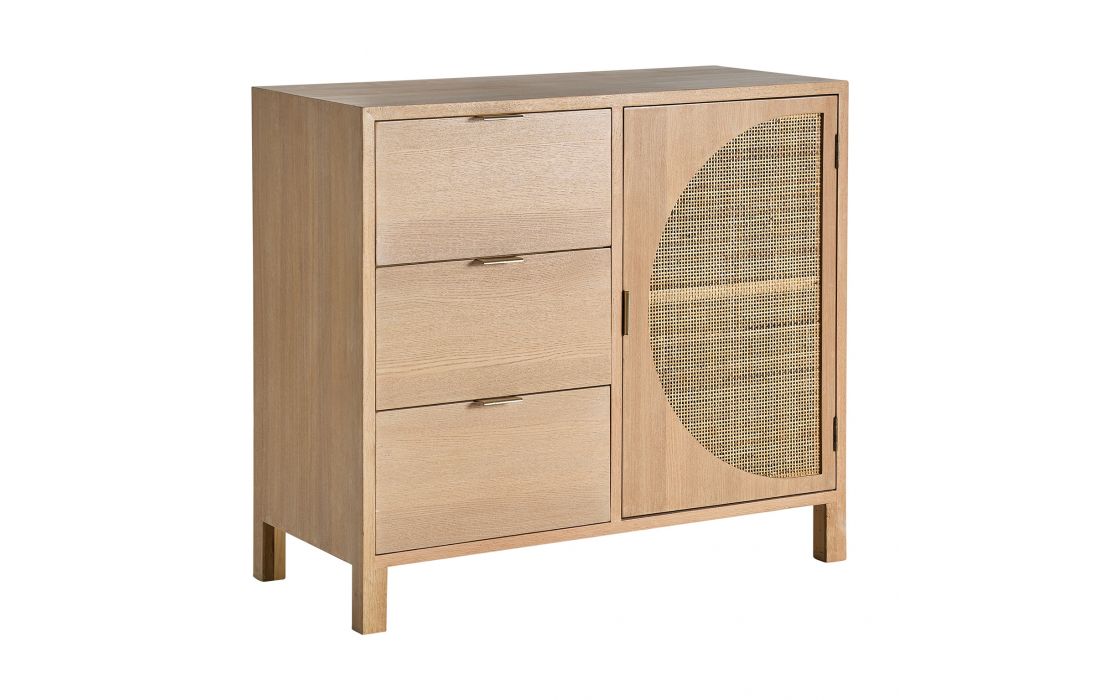 Cómoda feita em madeira de pinho com três gavetas e uma porta com um fino tecido de palhinha