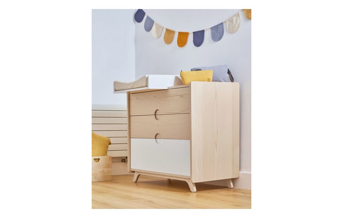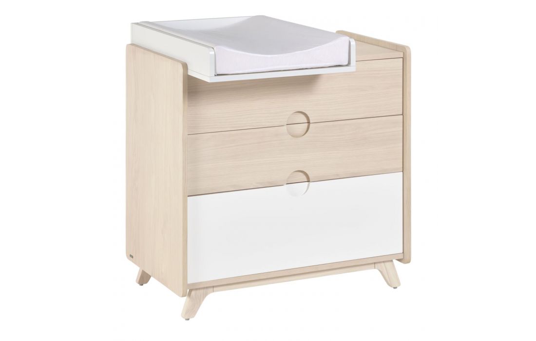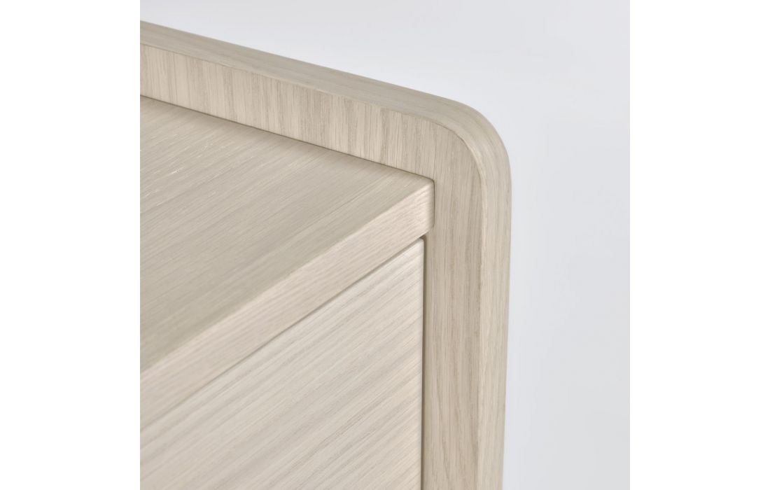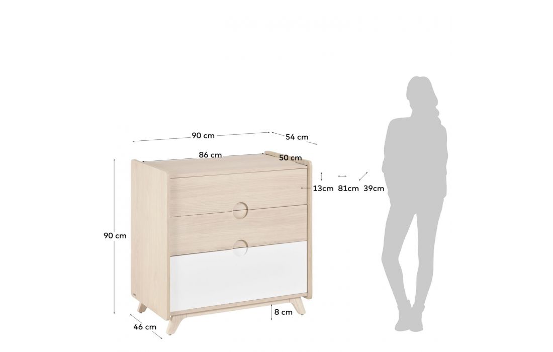 Cómoda com estrutura em MDF folheada a madeira de freixo e lacado branco, pés em madeira maciça de freixo