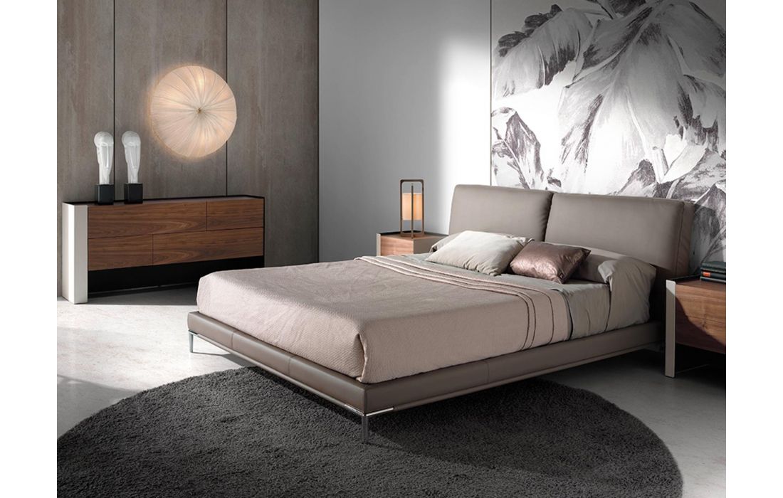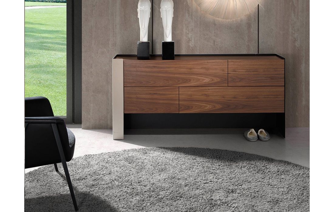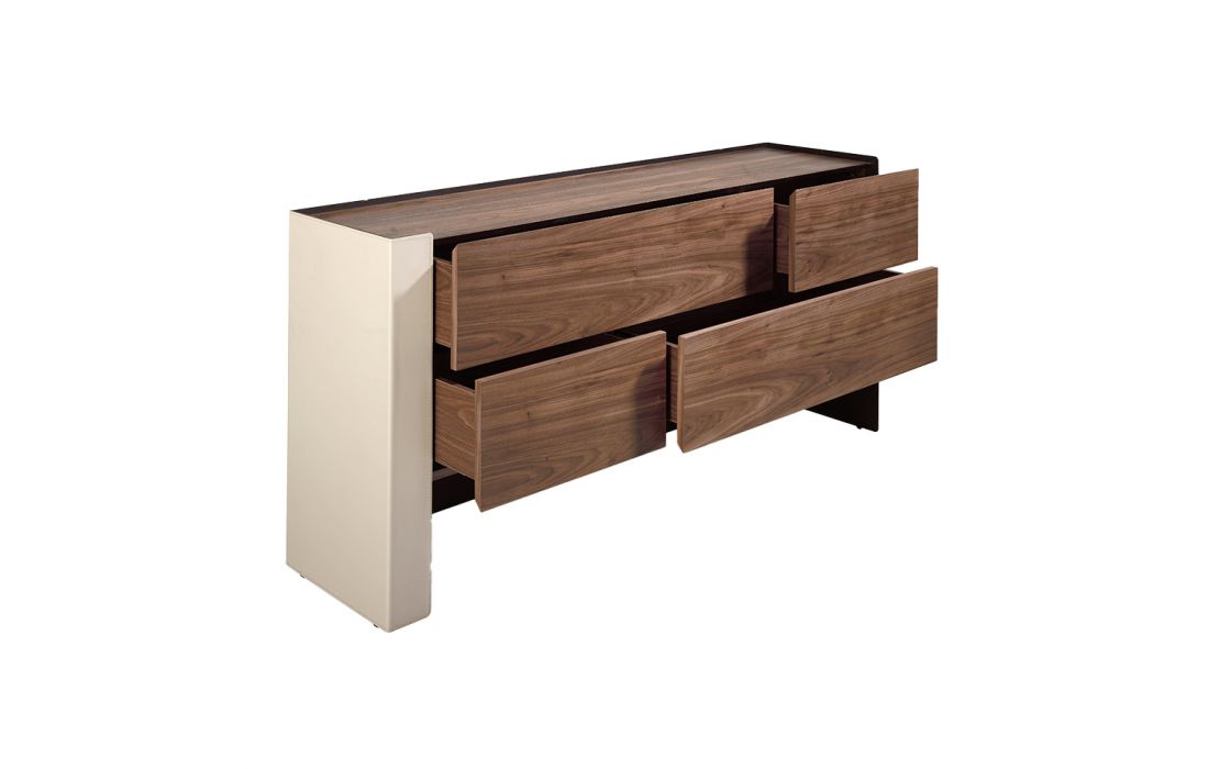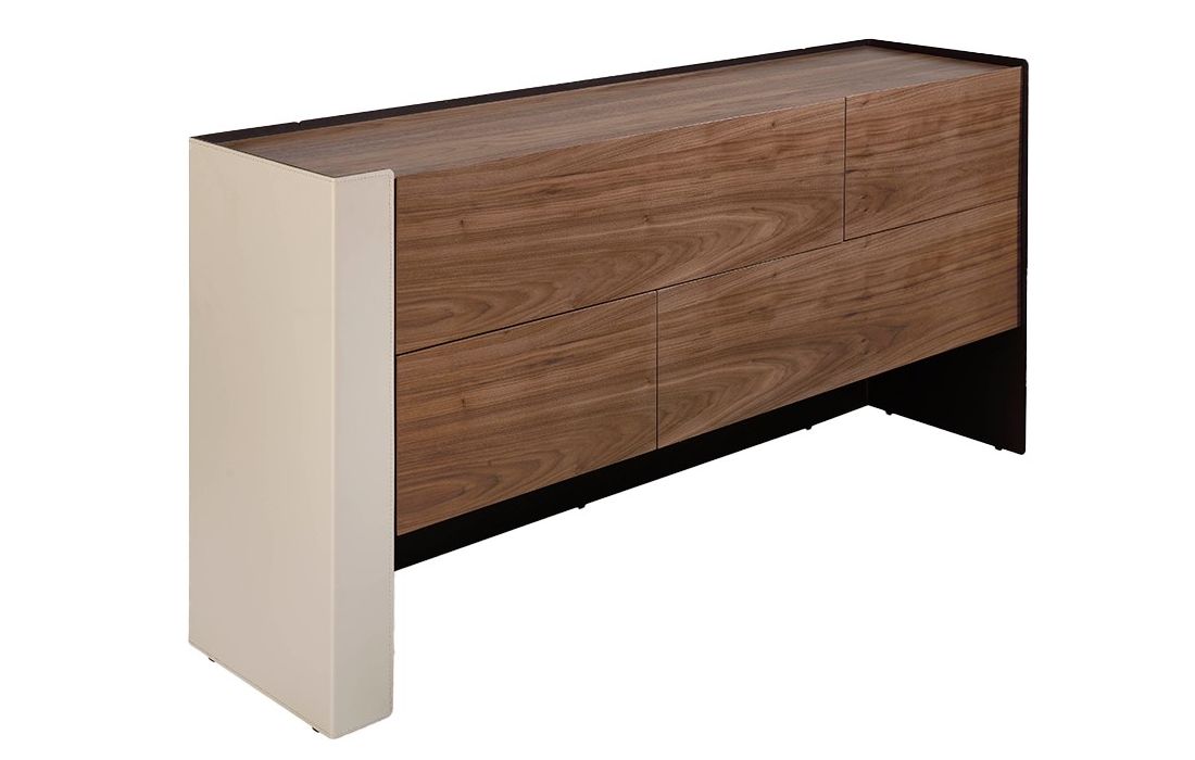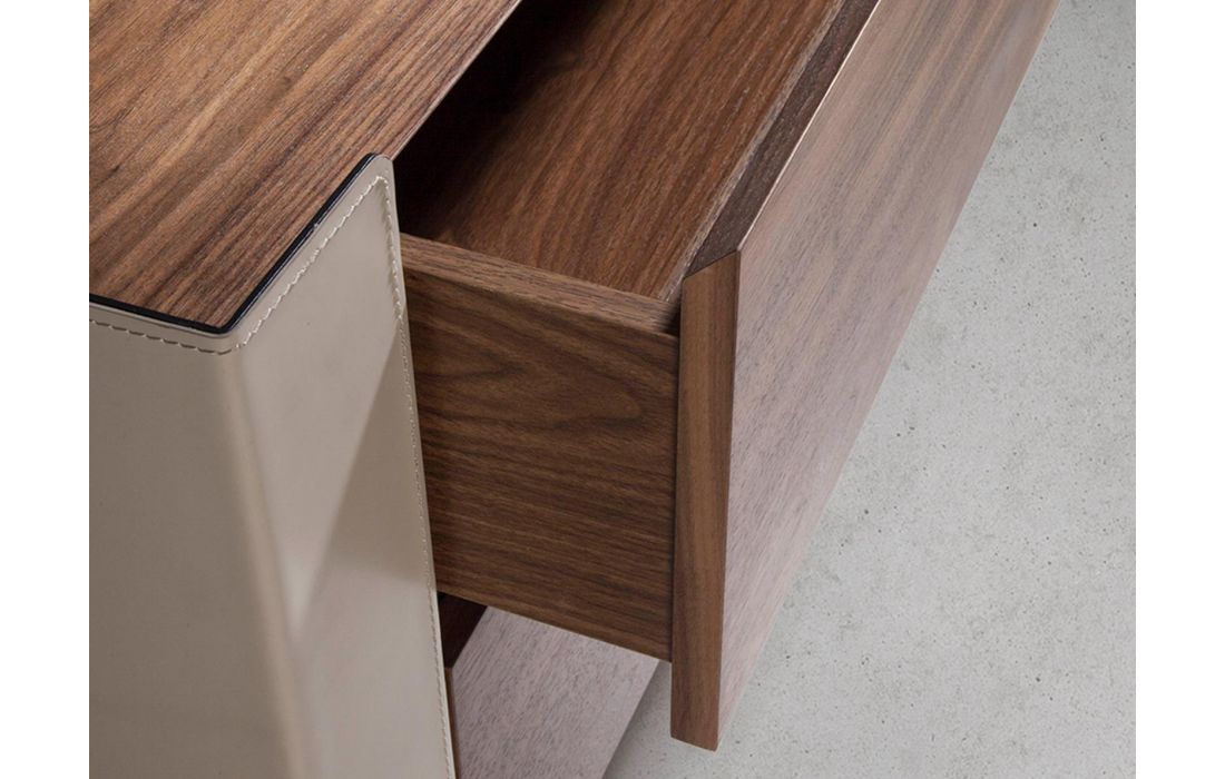 Cómoda em madeira folheada a nogueira e pele reciclada com gavetas com sistema de fecho suave.