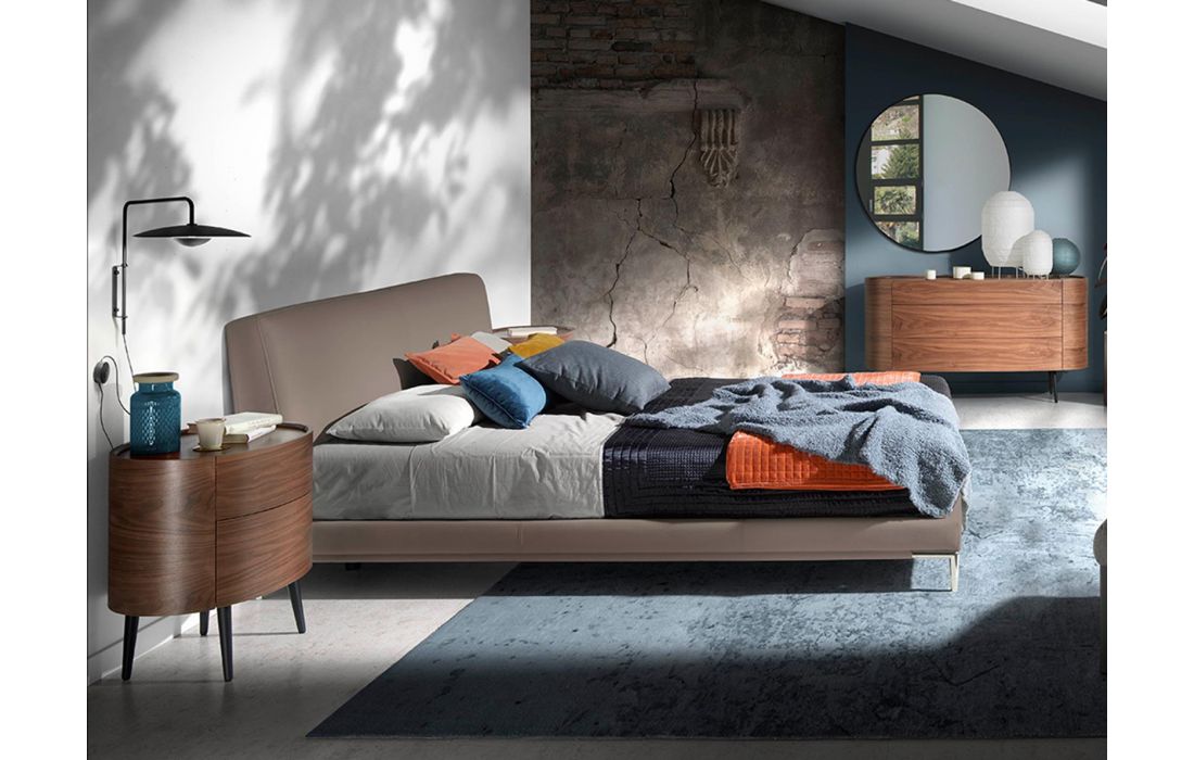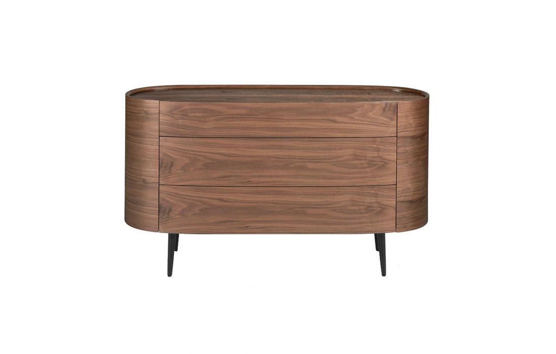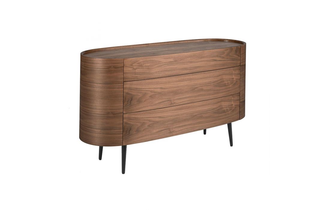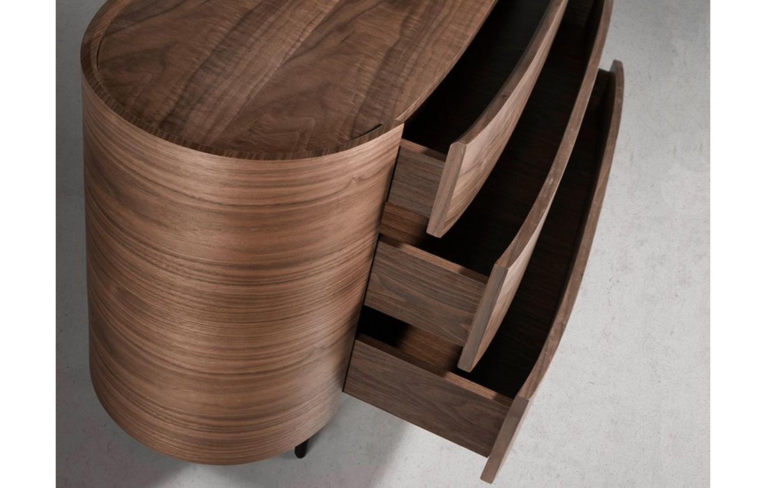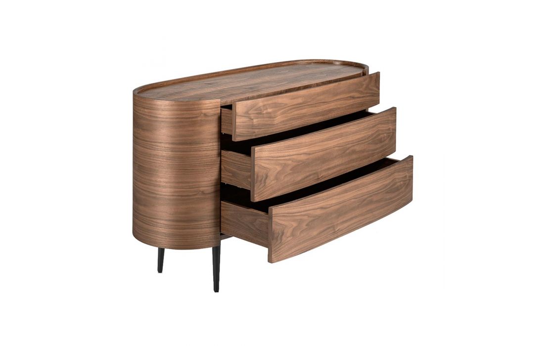 Cómoda oval em madeira de nogueira natural de 0,5 mm de espessura com 3 gavetas ocultas. Pés de madeira pintados de preto.